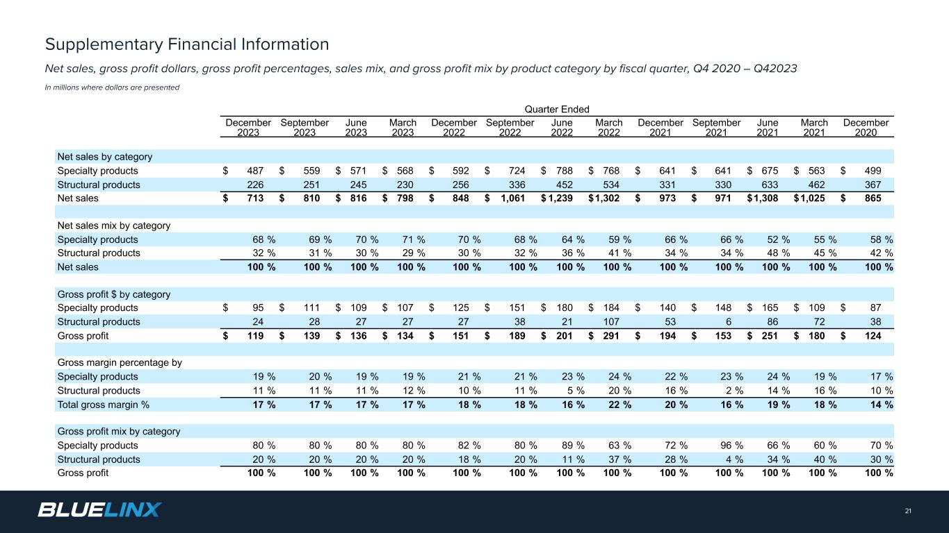 Net sales, gross profit dollars, gross profit percentages, sales mix, and gross profit mix by product category by fiscal quarter, Q4 2020 – Q42023 In millions where dollars are presented 21 Supplementary Financial Information Quarter Ended December 2023 September 2023 June 2023 March 2023 December 2022 September 2022 June 2022 March 2022 December 2021 September 2021 June 2021 March 2021 December 2020 Net sales by category Specialty products $ 487 $ 559 $ 571 $ 568 $ 592 $ 724 $ 788 $ 768 $ 641 $ 641 $ 675 $ 563 $ 499 Structural products 226 251 245 230 256 336 452 534 331 330 633 462 367 Net sales $ 713 $ 810 $ 816 $ 798 $ 848 $ 1,061 $ 1,239 $ 1,302 $ 973 $ 971 $ 1,308 $ 1,025 $ 865 Net sales mix by category Specialty products 68 % 69 % 70 % 71 % 70 % 68 % 64 % 59 % 66 % 66 % 52 % 55 % 58 % Structural products 32 % 31 % 30 % 29 % 30 % 32 % 36 % 41 % 34 % 34 % 48 % 45 % 42 % Net sales 100 % 100 % 100 % 100 % 100 % 100 % 100 % 100 % 100 % 100 % 100 % 100 % 100 % Gross profit $ by category Specialty products $ 95 $ 111 $ 109 $ 107 $ 125 $ 151 $ 180 $ 184 $ 140 $ 148 $ 165 $ 109 $ 87 Structural products 24 28 27 27 27 38 21 107 53 6 86 72 38 Gross profit $ 119 $ 139 $ 136 $ 134 $ 151 $ 189 $ 201 $ 291 $ 194 $ 153 $ 251 $ 180 $ 124 Gross margin percentage by categorySpecialty products 19 % 20 % 19 % 19 % 21 % 21 % 23 % 24 % 22 % 23 % 24 % 19 % 17 % Structural products 11 % 11 % 11 % 12 % 10 % 11 % 5 % 20 % 16 % 2 % 14 % 16 % 10 % Total gross margin % 17 % 17 % 17 % 17 % 18 % 18 % 16 % 22 % 20 % 16 % 19 % 18 % 14 % Gross profit mix by category Specialty products 80 % 80 % 80 % 80 % 82 % 80 % 89 % 63 % 72 % 96 % 66 % 60 % 70 % Structural products 20 % 20 % 20 % 20 % 18 % 20 % 11 % 37 % 28 % 4 % 34 % 40 % 30 % Gross profit 100 % 100 % 100 % 100 % 100 % 100 % 100 % 100 % 100 % 100 % 100 % 100 % 100 %