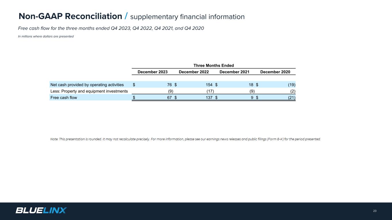 Adjusted EBITDA reconciliation by fiscal quarter, Q4 2020 – Q4 2023 In millions where dollars are presented 22 Non-GAAP Reconciliation / supplementary financial information (1) Reflects costs related to our restructuring efforts, such as severance, net of other one-time non-operating items. For the purposes of this presentation, items may be collapsed into this or other categories where they were presented separately in other presentations such as our press release. Items which may be collapsed include, but are not limited to, pension settlement and withdrawal costs and inventory step-up adjustments, among others. Note: Figures are rounded in this presentation to align with figures as presented in the deck. As a result, the rounded figures in this presentation may not agree to presentation in other formats we have published such as earnings releases, earnings decks, or other similar materials presented elsewhere. Quarter Ended December 2023 December 2022 December 2021 December 2020 Net income (loss) $ (18) $ 32 $ 74 $ 20 Adjustments: Depreciation and amortization 8 7 7 7 Interest expense, net 4 9 10 11 Adjustment to debt issuance cost associated with term loan/ revolver(1) — — 1 — Provision for (benefit from) income taxes 10 9 25 — Share-based compensation expense 3 4 2 2 Amortization of deferred gain on real estate (1) (1) (1) (1) Gain from sales of property — — (7) (1) Pension termination and related expenses(1) 31 — — Acquisition-related costs(1)(2) — 1 — — Restructuring and other (1) (1) 2 1 1 Adjusted EBITDA $ 36 $ 63 $ 112 $ 39 Net Sales $ 713 $ 848 $ 973 865 Adjusted EBITDA 36 63 112 39 Adjusted EBITDA Margin 5.1 % 7.4 % 11.5 % 4.5 %