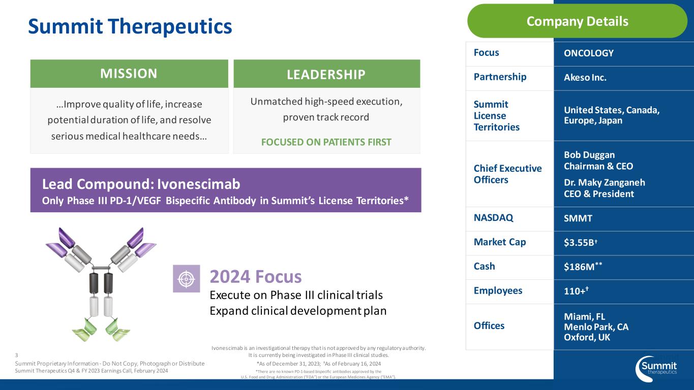 Forward Looking Statement Ivonescimab is an investigational therapy that is not approved by any regulatory authority. It is currently being investigated in Phase III clinical studies. 2 Summit Proprietary Information - Do Not Copy, Photograph or Distribute Oppenheimer 34th Annual Healthcare Life Sciences Conference, February 2024 Any statements in this presentation about the Company’s future expectations, plans and prospects, including but not limited to, statements about the clinical and preclinical development of the Company’s product candidates, entry into and actions related to the Company’s partnership with Akeso Inc., the therapeutic potential of the Company’s product candidates, the potential commercialization of the Company’s product candidates, the timing of initiation, completion and availability of data from clinical trials, the potential submission of applications for marketing approvals, potential acquisitions and other statements containing the words "anticipate," "believe," "continue," "could," "estimate," "expect," "intend," "may," "plan," "potential," "predict," "project," "should," "target," "would," and similar expressions, constitute forward-looking statements within the meaning of The Private Securities Litigation Reform Act of 1995. Actual results may differ materially from those indicated by such forward-looking statements as a result of various important factors, including the results of our evaluation of the underlying data in connection with the development and commercialization activities for ivonescimab, the outcome of discussions with regulatory authorities, including the Food and Drug Administration, the uncertainties inherent in the initiation of future clinical trials, availability and timing of data from ongoing and future clinical trials, the results of such trials, and their success, and global public health crises that may affect timing and status of our clinical trials and operations, whether preliminary results from a clinical trial will be predictive of the final results of that trial or whether results of early clinical trials or preclinical studies will be indicative of the results of later clinical trials, whether business development opportunities to expand the Company’s pipeline of drug candidates, including without limitation, through potential acquisitions of, and/or collaborations with, other entities occur, expectations for regulatory approvals, laws and regulations affecting government contracts and funding awards, availability of funding sufficient for the Company’s foreseeable and unforeseeable operating expenses and capital expenditure requirements and other factors discussed in the "Risk Factors" section of filings that the Company makes with the Securities and Exchange Commission. Any change to our ongoing trials could cause delays, affect our future expenses, and add uncertainty to our commercialization efforts, as well as to affect the likelihood of the successful completion of clinical development of ivonescimab. Accordingly, the audience should not place undue reliance on forward-looking statements or information. In addition, any forward-looking statements included in this presentation represent the Company’s views only as of the date of this presentation and should not be relied upon as representing the Company’s views as of any subsequent date. The Company specifically disclaims any obligation to update any forward-looking statements included in this presentation.