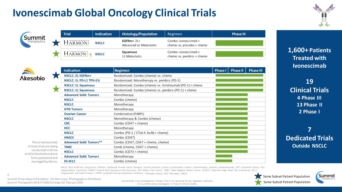 Company Details Focus ONCOLOGY Partnership Akeso Inc. Summit License Territories United States, Canada, Europe, Japan Chief Executive Officers Bob Duggan Chairman & CEO Dr. Maky Zanganeh CEO & President NASDAQ SMMT Market Cap $3.55B† Cash $186M** Employees 110+† Offices Miami, FL Menlo Park, CA Oxford, UK …Improve quality of life, increase potential duration of life, and resolve serious medical healthcare needs… MISSION Unmatched high-speed execution, proven track record FOCUSED ON PATIENTS FIRST LEADERSHIP Lead Compound: Ivonescimab Only Phase III PD-1/VEGF Bispecific Antibody in Summit’s License Territories* 2024 Focus Execute on Phase III clinical trials Expand clinical development plan Summit Therapeutics 3 Summit Proprietary Information - Do Not Copy, Photograph or Distribute Summit Therapeutics Q4 & FY 2023 Earnings Call, February 2024 Ivonescimab is an investigational therapy that is not approved by any regulatory authority. It is currently being investigated in Phase III clinical studies. *There are no known PD-1-based bispecific antibodies approved by the U.S. Food and Drug Administration (“FDA”) or the European Medicines Agency (“EMA”). *As of December 31, 2023; †As of February 16, 2024