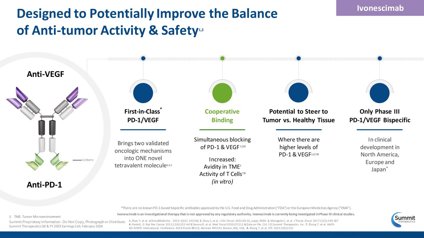 Trial Indication Histology/Population Regimen Phase III NSCLC EGFRm+ 2L+ Advanced or Metastatic Combo ivonescimab + chemo vs. placebo + chemo NSCLC Squamous 1L Metastatic Combo ivonescimab + chemo vs. pembro + chemo Indication Regimen Phase I Phase II Phase III NSCLC: 2L EGFRm+ Randomized: Combo (chemo) vs. chemo NSCLC: 1L PD-L1 TPS>1% Randomized: Monotherapy vs. pembro (PD-1) NSCLC: 1L Squamous Randomized: Combo (chemo) vs. tislelizumab (PD-1) + chemo NSCLC: 1L Squamous Randomized: Combo (chemo) vs. pembro (PD-1) + chemo Advanced Solid Tumors Monotherapy NSCLC Combo (chemo) NSCLC Monotherapy GYN Tumors Monotherapy Ovarian Cancer Combination (PARPi) NSCLC Monotherapy & Combo (chemo) CRC Combo (CD47 + chemo) HCC Monotherapy NSCLC Combo (PD-1 / CTLA-4 bsAb + chemo) HNSCC Combo (CD47) Advanced Solid Tumors** Combo (CD47, CD47 + chemo, chemo) TNBC Comb (chemo, CD47 + chemo) NSCLC Combo (CD73 + chemo) Advanced Solid Tumors Monotherapy ES-SCLC Combo (chemo) Ivonescimab Global Oncology Clinical Trials These ivonescimab cl inical trials are being conducted in China and/or Australia and are ful ly sponsored and managed by Akeso. NSCLC: Non-Small-cell Lung Cancer, EGFRm+: Epidermal Growth Factor Receptor mutant positives, Combo: Combination, Chemo: Chemotherapy, pembro: pembrolizumab, CRC: Colorectal Cancer, HCC: Hepatocellular Carcinoma, HNSCC: Head & Neck Squamous Cell Carcinoma, BTC: Biliary Tract Cancer, TNBC: Triple Negative Breast Cancer, ES-SCLC: Extensive Stage Small Cell Lung Cancer, PD-1: Programmed Cell Death Protein 1, PARPi: poly(ADP-ribose) polymerase inhibitors Ivonescimab is an investigational therapy that is not approved by any regulatory authority. It is currently being investigated in Phase III clinical studies. **Includes Gastric, BTC, Pancreatic, NSCLC Same Subset Patient Population 1,600+ Patients Treated with Ivonescimab 19 Clinical Trials 4 Phase III 13 Phase II 2 Phase I 7 Dedicated Trials Outside NSCLC 4 Summit Proprietary Information - Do Not Copy, Photograph or Distribute Summit Therapeutics Q4 & FY 2023 Earnings Call, February 2024 Same Subset Patient Population