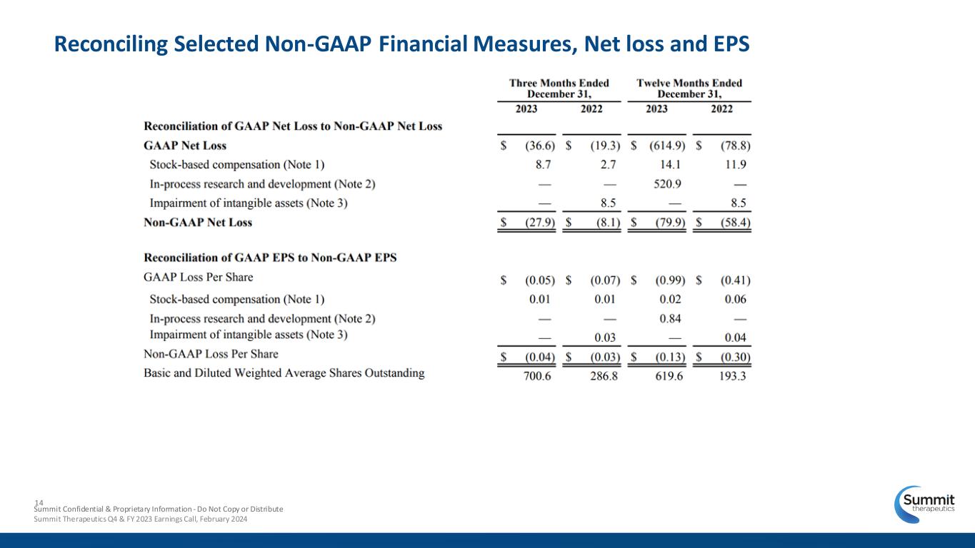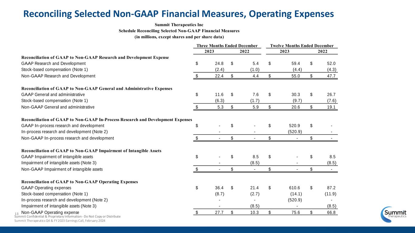13 Reconciling Selected Non-GAAP Financial Measures, Operating Expenses Summit Confidential & Proprietary Information - Do Not Copy or Distribute Summit Therapeutics Q4 & FY 2023 Earnings Call, February 2024 2023 2022 2023 2022 Reconciliation of GAAP to Non-GAAP Research and Development Expense GAAP Research and Development $ 24.8 $ 5.4 $ 59.4 $ 52.0 Stock-based compensation (Note 1) (2.4) (1.0) (4.4) (4.3) Non-GAAP Research and Development $ 22.4 $ 4.4 $ 55.0 $ 47.7 Reconciliation of GAAP to Non-GAAP General and Administrative Expenses GAAP General and administrative $ 11.6 $ 7.6 $ 30.3 $ 26.7 Stock-based compensation (Note 1) (6.3) (1.7) (9.7) (7.6) Non-GAAP General and administrative $ 5.3 $ 5.9 $ 20.6 $ 19.1 Reconciliation of GAAP to Non-GAAP In-Process Research and Development Expenses GAAP In-process research and development $ - $ - $ 520.9 $ - In-process research and development (Note 2) - - (520.9) - Non-GAAP In-process research and development $ - $ - $ - $ - Reconciliation of GAAP to Non-GAAP Impairment of Intangible Assets GAAP Impairment of intangible assets $ - $ 8.5 $ - $ 8.5 Impairment of intangible assets (Note 3) - (8.5) - (8.5) Non-GAAP Impairment of intangible assets $ - $ - $ - $ - Reconciliation of GAAP to Non-GAAP Operating Expenses GAAP Operating expenses $ 36.4 $ 21.4 $ 610.6 $ 87.2 Stock-based compensation (Note 1) (8.7) (2.7) (14.1) (11.9) In-process research and development (Note 2) - - (520.9) - Impairment of intangible assets (Note 3) - (8.5) - (8.5) Non-GAAP Operating expense $ 27.7 $ 10.3 $ 75.6 $ 66.8 Three Months Ended December Twelve Months Ended December Summit Therapeutics Inc Schedule Reconciling Selected Non-GAAP Financial Measures (in millions, except shares and per share data)