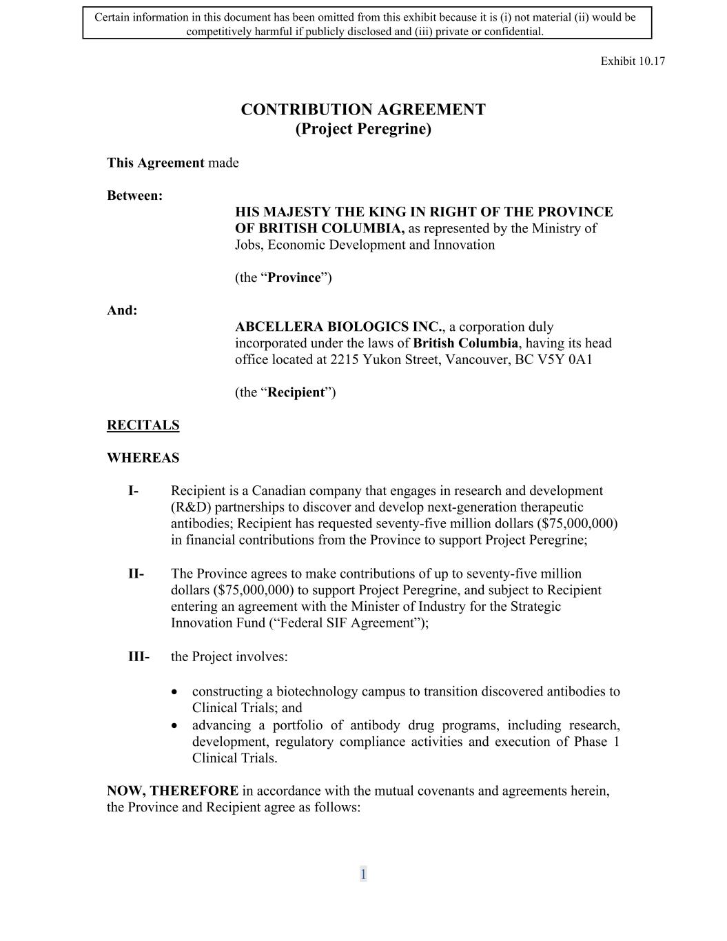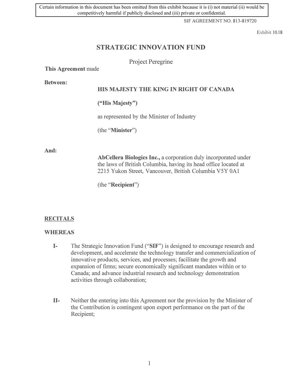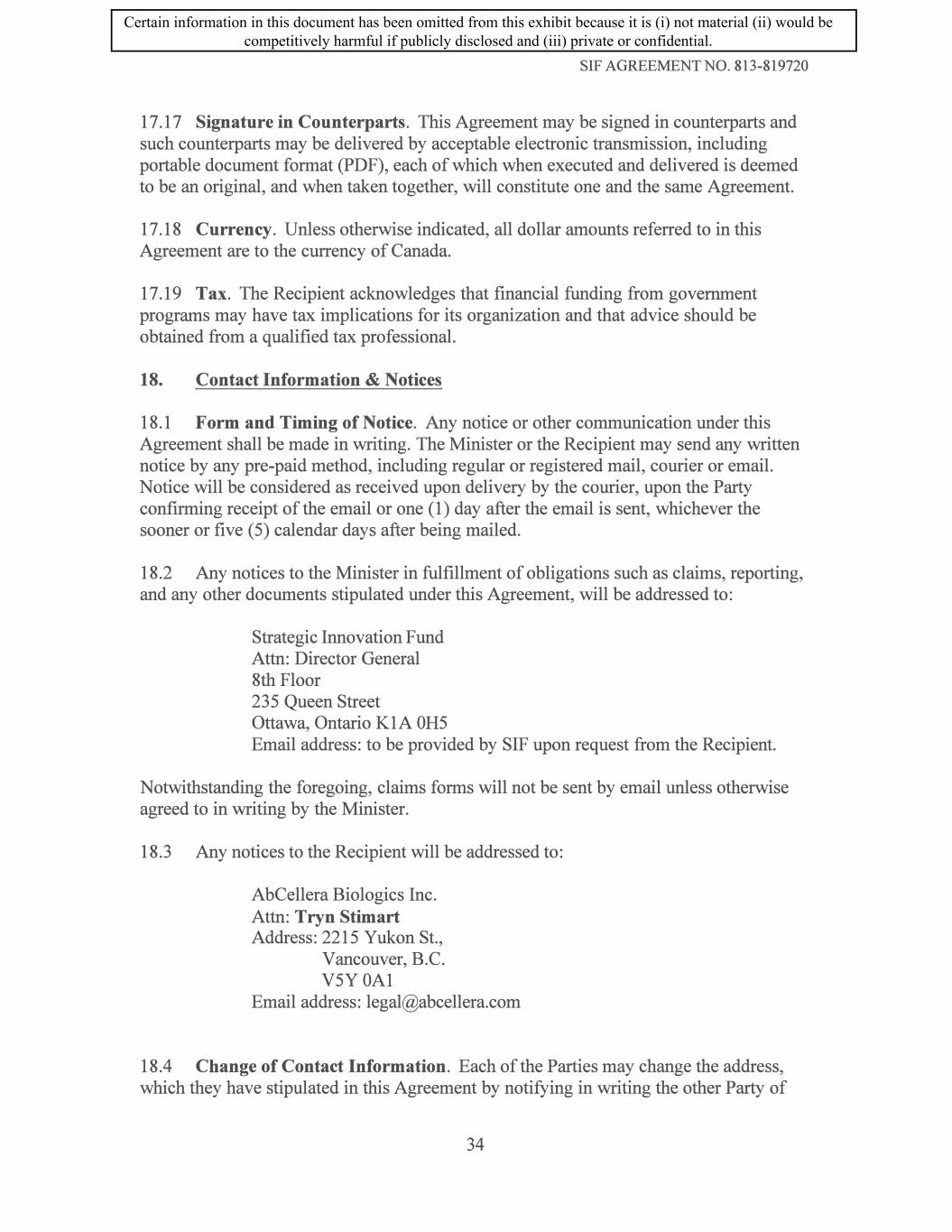 SIF AGREEMENT NO. 813-819720 17 .17 Signature in Counterparts. This Agreement may be signed in counterparts and such counterparts may be delivered by acceptable electronic transmission, including portable document format (PDF), each of which when executed and delivered is deemed to be an original, and when taken together, will constitute one and the same Agreement. 17.18 Currency. Unless otherwise indicated, all dollar amounts referred to in this Agreement are to the currency of Canada. 17.19 Tax. The Recipient acknowledges that financial funding from government programs may have tax implications for its organization and that advice should be obtained from a qualified tax professional. 18. Contact Information & Notices 18.1 Form and Timing of Notice. Any notice or other communication under this Agreement shall be made in writing. The Minister or the Recipient may send any written notice by any pre-paid method, including regular or registered mail, courier or email. Notice will be considered as received upon delivery by the courier, upon the Party confirming receipt of the email or one (1) day after the email is sent, whichever the sooner or five ( 5) calendar days after being mailed. 18.2 Any notices to the Minister in fulfillment of obligations such as claims, reporting, and any other documents stipulated under this Agreement, will be addressed to: Strategic Innovation Fund Attn: Director General 8th Floor 235 Queen Street Ottawa, Ontario KIA OHS Email address: to be provided by SIF upon request from the Recipient. Notwithstanding the foregoing, claims forms will not be sent by email unless otherwise agreed to in writing by the Minister. 18.3 Any notices to the Recipient will be addressed to: AbCellera Biologics Inc. Attn: Tryn Stimart Address: 2215 Yukon St., Vancouver, B.C. V5Y 0Al Email address: legal@abcellera.com 18.4 Change of Contact Information. Each of the Parties may change the address, which they have stipulated in this Agreement by notifying in writing the other Party of 34 Certain information in this document has been omitted from this exhibit because it is (i) not material (ii) would be competitively harmful if publicly disclosed and (iii) private or confidential.