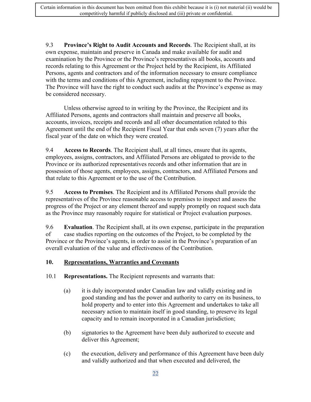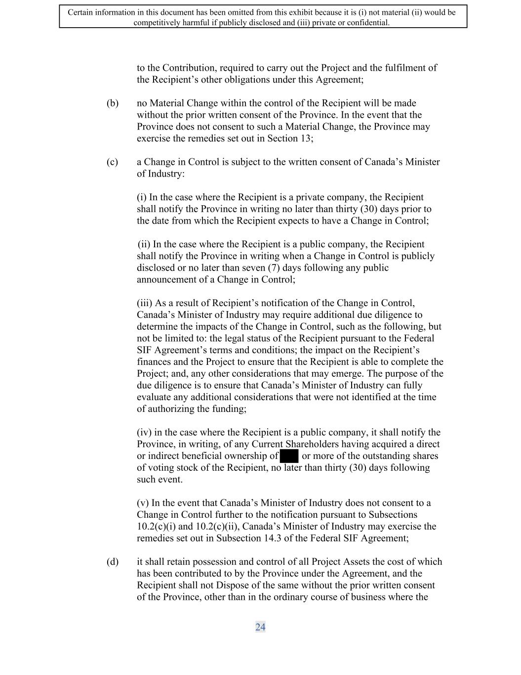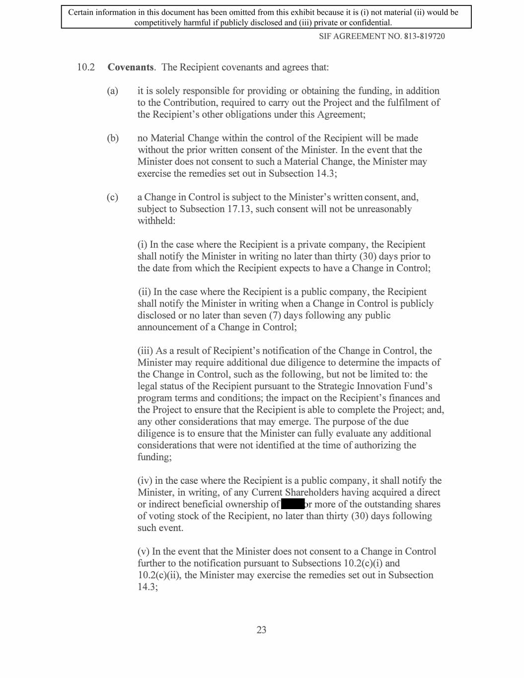 SIF AGREEMENT NO. 813-819720 10.2 Covenants. The Recipient covenants and agrees that: (a) it is solely responsible for providing or obtaining the funding, in addition to the Contribution, required to carry out the Project and the fulfilment of the Recipient's other obligations under this Agreement; (b) no Material Change within the control of the Recipient will be made without the prior written consent of the Minister. In the event that the Minister does not consent to such a Material Change, the Minister may exercise the remedies set out in Subsection 14.3; (c) a Change in Control is subject to the Minister's written consent, and, subject to Subsection 17.13, such consent will not be unreasonably withheld: (i) In the case where the Recipient is a private company, the Recipient shall notify the Minister in writing no later than thirty (30) days prior to the date from which the Recipient expects to have a Change in Control; (ii) In the case where the Recipient is a public company, the Recipient shall notify the Minister in writing when a Change in Control is publicly disclosed or no later than seven (7) days following any public announcement of a Change in Control; (iii) As a result of Recipient's notification of the Change in Control, the Minister may require additional due diligence to determine the impacts of the Change in Control, such as the following, but not be limited to: the legal status of the Recipient pursuant to the Strategic Innovation Fund's program terms and conditions; the impact on the Recipient's finances and the Project to ensure that the Recipient is able to complete the Project; and, any other considerations that may emerge. The purpose of the due diligence is to ensure that the Minister can fully evaluate any additional considerations that were not identified at the time of authorizing the funding; (iv) in the case where the Recipient is a public company, it shall notify the Minister, in writing, of any Current Shareholders having acquired a direct or indirect beneficial ownership of�r more of the outstanding shares of voting stock of the Recipient, no later than thirty (30) days following such event. (v) In the event that the Minister does not consent to a Change in Control further to the notification pursuant to Subsections 10.2(c)(i) and 10.2(c)(ii), the Minister may exercise the remedies set out in Subsection 14.3; 23 Certain information in this document has been omitted from this exhibit because it is (i) not material (ii) would be competitively harmful if publicly disclosed and (iii) private or confidential.