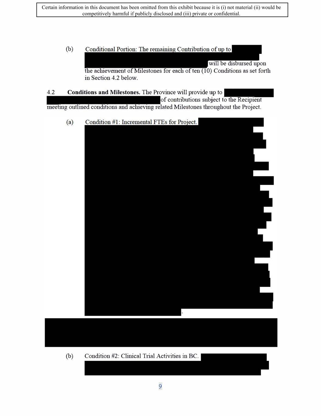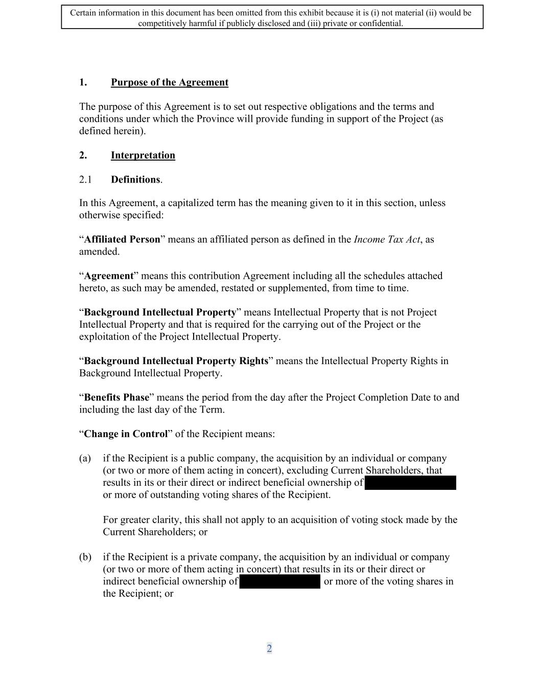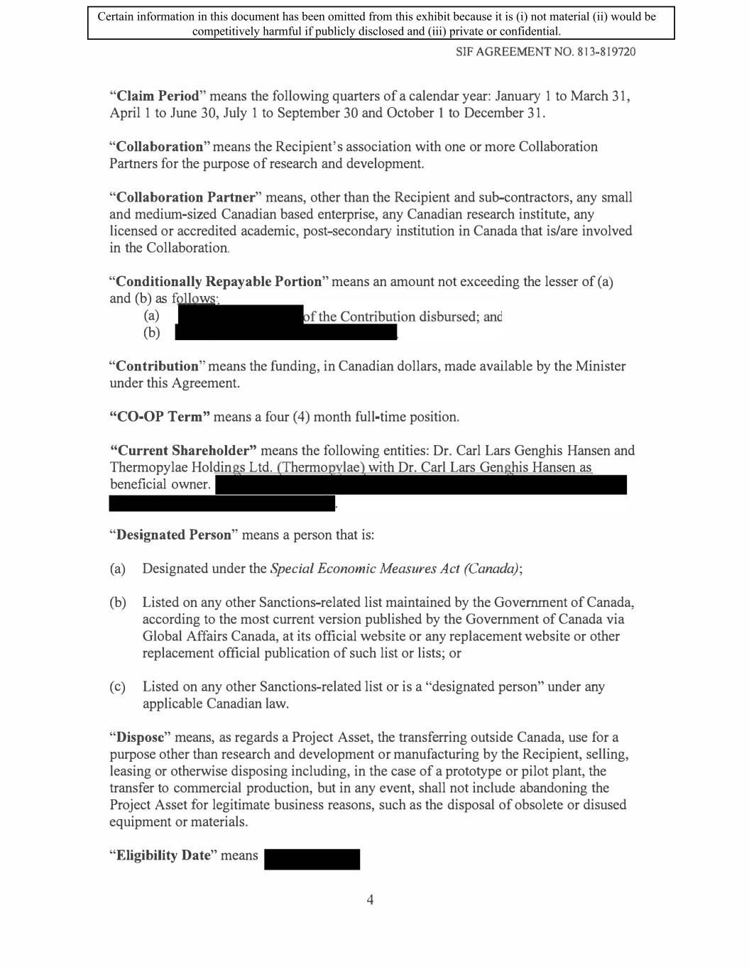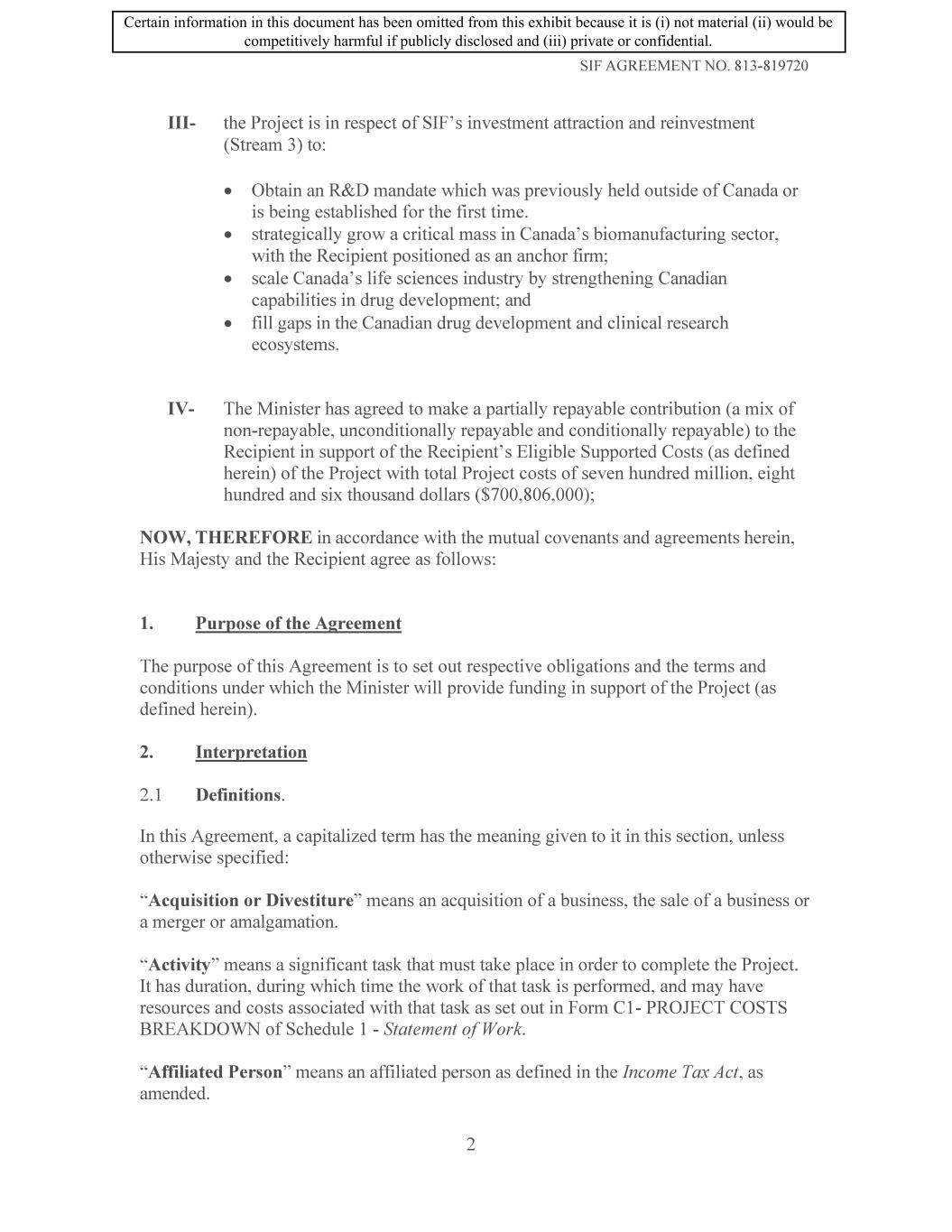 SIF AGREEMENT NO. 813-819720 10.2 Covenants. The Recipient covenants and agrees that: (a) it is solely responsible for providing or obtaining the funding, in addition to the Contribution, required to carry out the Project and the fulfilment of the Recipient's other obligations under this Agreement; (b) no Material Change within the control of the Recipient will be made without the prior written consent of the Minister. In the event that the Minister does not consent to such a Material Change, the Minister may exercise the remedies set out in Subsection 14.3; (c) a Change in Control is subject to the Minister's written consent, and, subject to Subsection 17.13, such consent will not be unreasonably withheld: (i) In the case where the Recipient is a private company, the Recipient shall notify the Minister in writing no later than thirty (30) days prior to the date from which the Recipient expects to have a Change in Control; (ii) In the case where the Recipient is a public company, the Recipient shall notify the Minister in writing when a Change in Control is publicly disclosed or no later than seven (7) days following any public announcement of a Change in Control; (iii) As a result of Recipient's notification of the Change in Control, the Minister may require additional due diligence to determine the impacts of the Change in Control, such as the following, but not be limited to: the legal status of the Recipient pursuant to the Strategic Innovation Fund's program terms and conditions; the impact on the Recipient's finances and the Project to ensure that the Recipient is able to complete the Project; and, any other considerations that may emerge. The purpose of the due diligence is to ensure that the Minister can fully evaluate any additional considerations that were not identified at the time of authorizing the funding; (iv) in the case where the Recipient is a public company, it shall notify the Minister, in writing, of any Current Shareholders having acquired a direct or indirect beneficial ownership of�r more of the outstanding shares of voting stock of the Recipient, no later than thirty (30) days following such event. (v) In the event that the Minister does not consent to a Change in Control further to the notification pursuant to Subsections 10.2(c)(i) and 10.2(c)(ii), the Minister may exercise the remedies set out in Subsection 14.3; 23 Certain information in this document has been omitted from this exhibit because it is (i) not material (ii) would be competitively harmful if publicly disclosed and (iii) private or confidential.