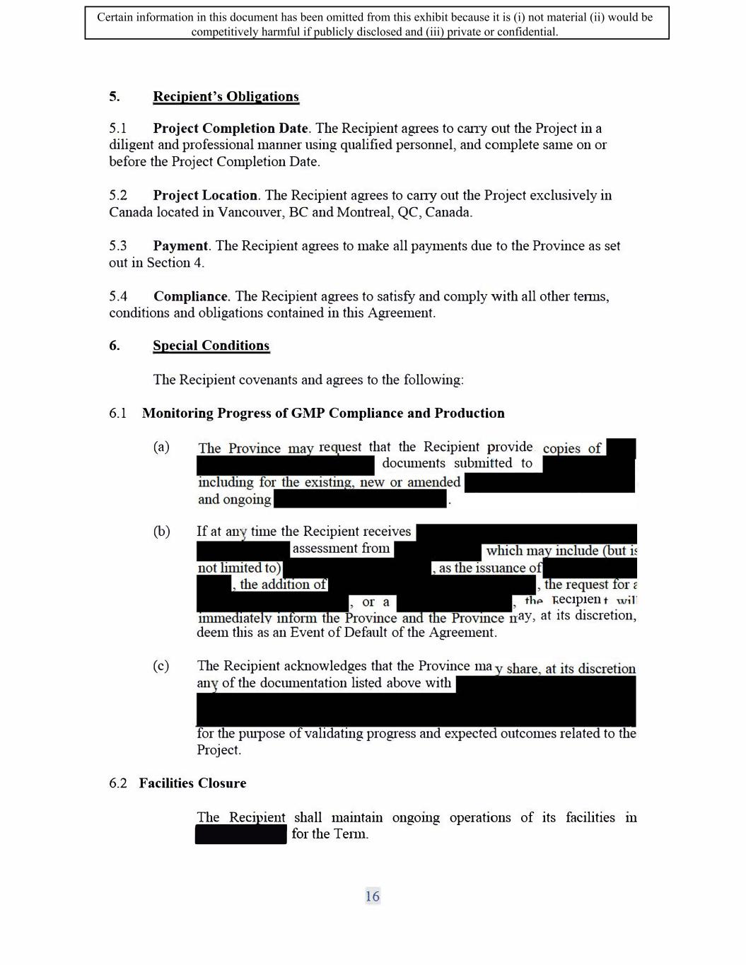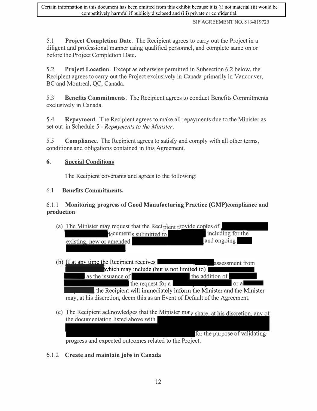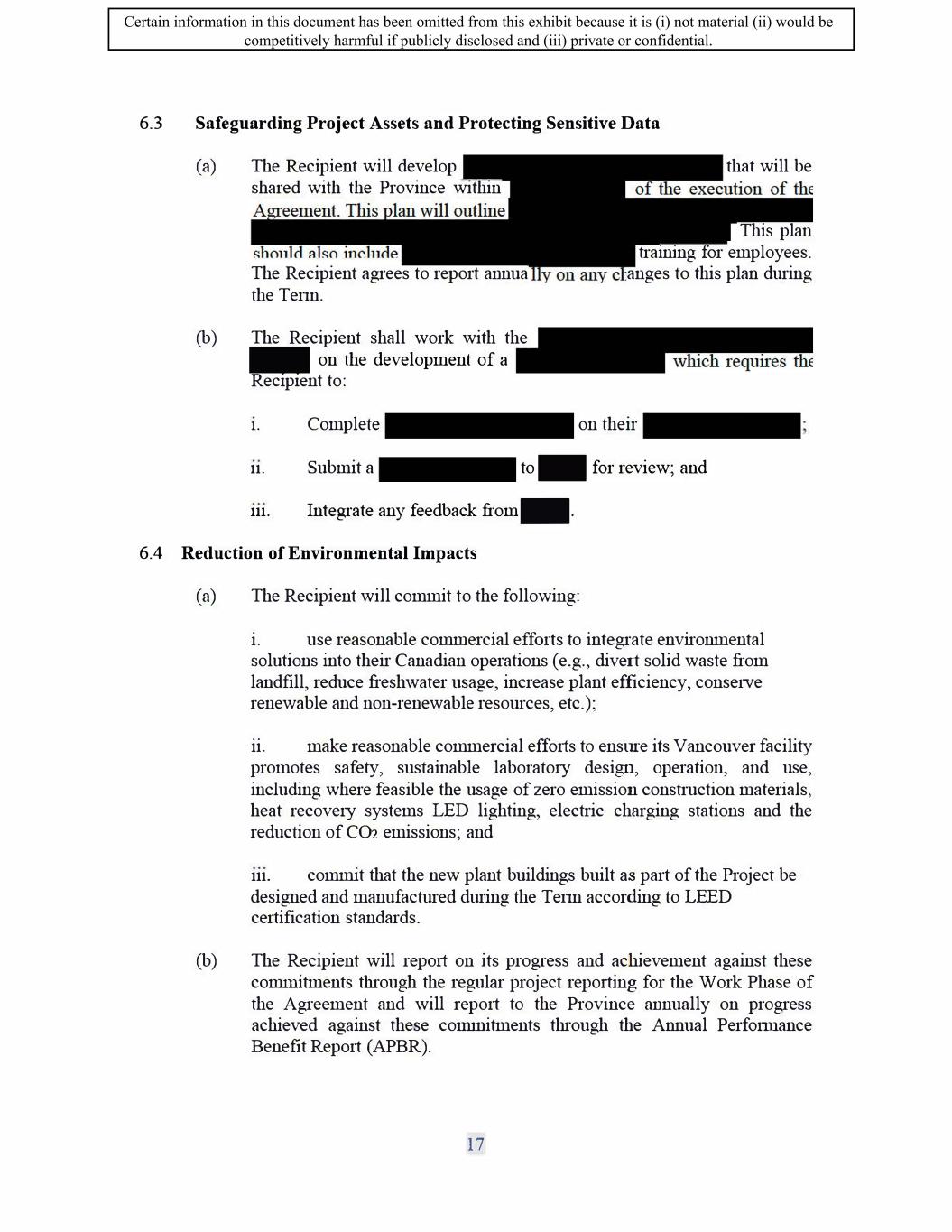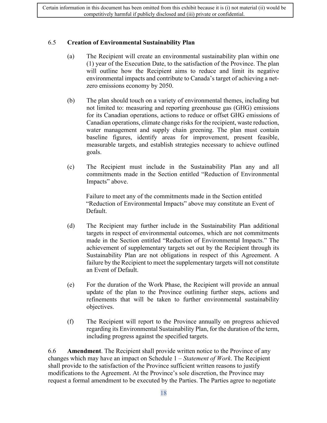 SIF AGREEMENT NO. 813-819720 (f) The Recipient will report to the Minister through the Annual Performance Benefits Report on progress achieved regarding its equity, diversity, and inclusion plan, including updates on progress made against the targets for the duration of the Term. 6.1.10 Reduction of Environmental Impacts (a) The Recipient will commit to the following: a. The Recipient will use reasonable commercial efforts to integrate environmental solutions into their Canadian operations ( e.g. divert solid waste from landfill, reduce fresh water usage, increase plant efficiency, conserve renewable and non-renewable resources etc.) b. The Recipient will make reasonable commercial efforts to ensure its Vancouver facility promotes safety ( e.g. Sustainable laboratory design, operation, and use, including where feasible the usage of zero emission construction materials, heat recovery systems LED lighting, electric charging stations and the reduction of CO2 emissions.) c. The Recipient will commit that the new plant buildings built as part of the Project be designed and manufactured during the Term according to LEED certification standards. (b) The Recipient will report on its progress and achievement against these commitments through the regular project reporting for the Work Phase of the agreement, and will report to The Minister annually on progress achieved against these commitments through the Annual Performance Benefit Report (APBR). 6.1.11 Creation of Environmental Sustainability Plan (a) The Recipient will create an environmental sustainability plan within one (1) year of the Execution Date of the Agreement, to the satisfaction of the Minister. The plan will outline how the Recipient aims to reduce and limit its negative environmental impacts and contribute to Canada's target of achieving a net-zero emissions economy by 2050. (b) The plan should touch on a variety of environmental themes, including but not limited to: measuring and reporting greenhouse gas (GHG) emissions for its Canadian operations, actions to reduce or offset GHG emissions of Canadian operations, climate change risks for the recipient, waste reduction, water management and supply chain greening. The plan must contain baseline figures, identify areas for improvement, present feasible, measurable targets, and establish strategies necessary to achieve outlined goals. ( c) The Recipient must include in the Sustainability Plan any and all commitments made in the Section entitled "Reduction of Environmental Impacts" above. a. Failure to meet any of the commitments made in the Section entitled "Reduction of Environmental Impacts" above may constitute an Event of Default. 16 Certain information in this document has been omitted from this exhibit because it is (i) not material (ii) would be competitively harmful if publicly disclosed and (iii) private or confidential.