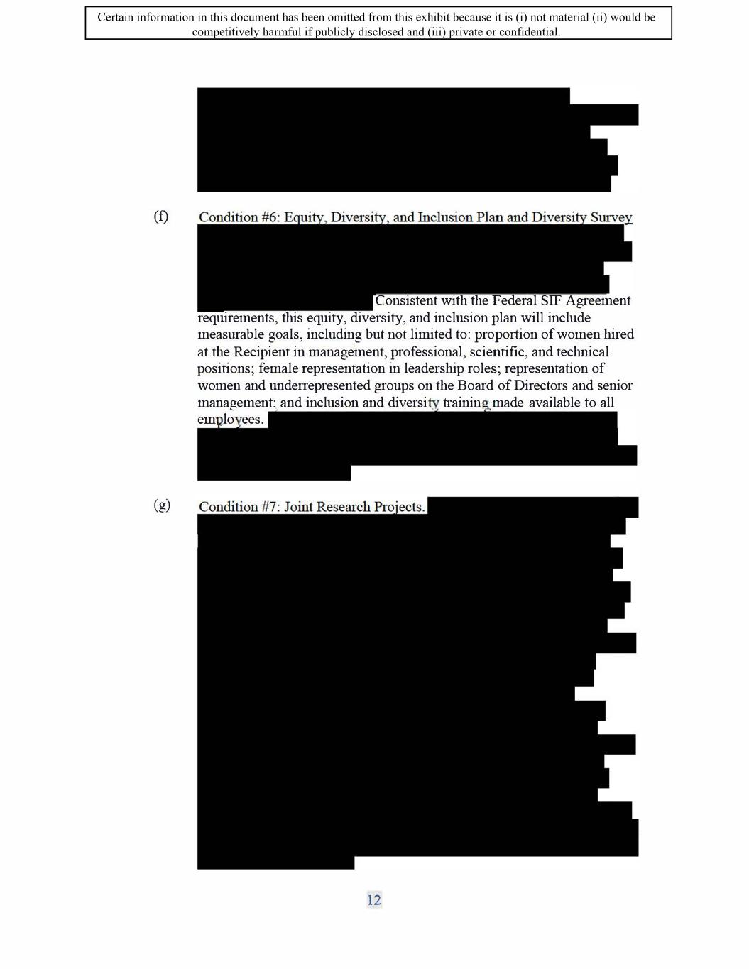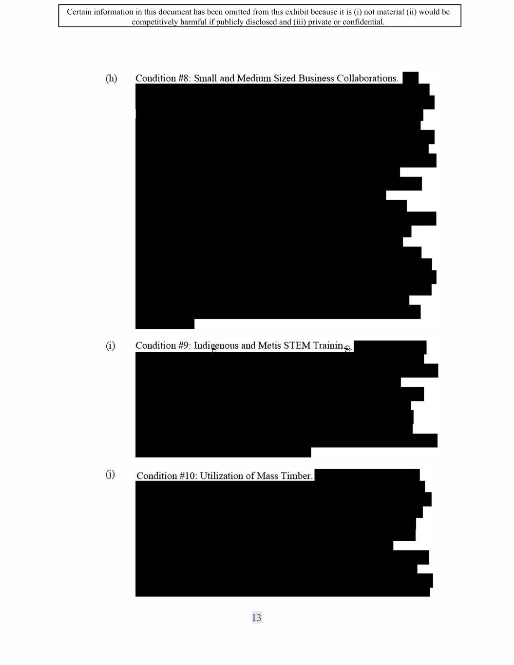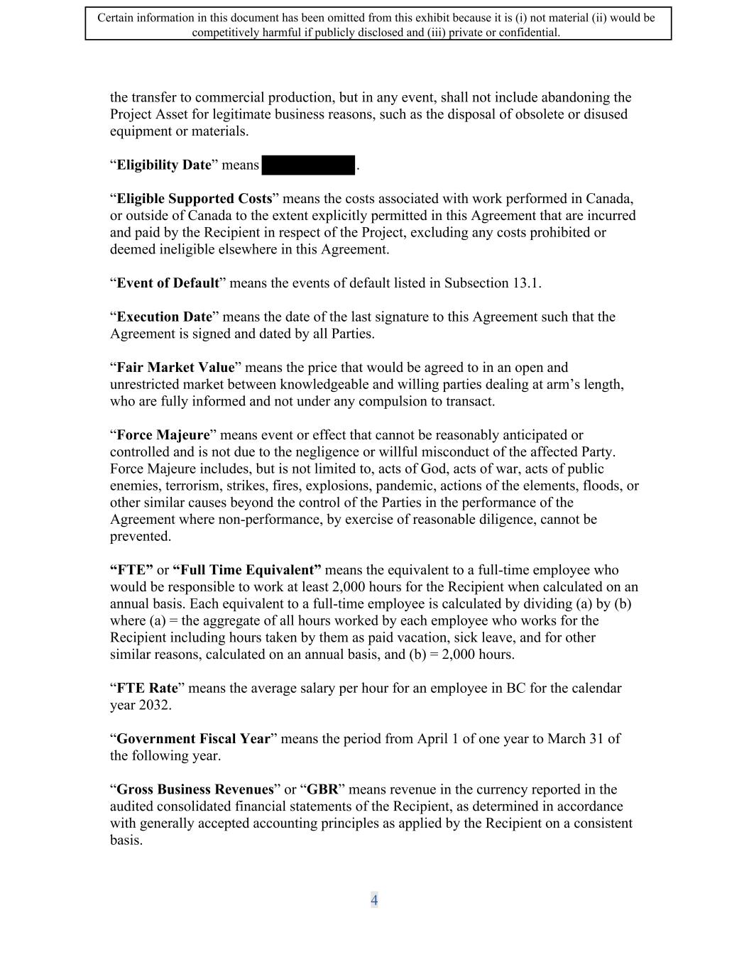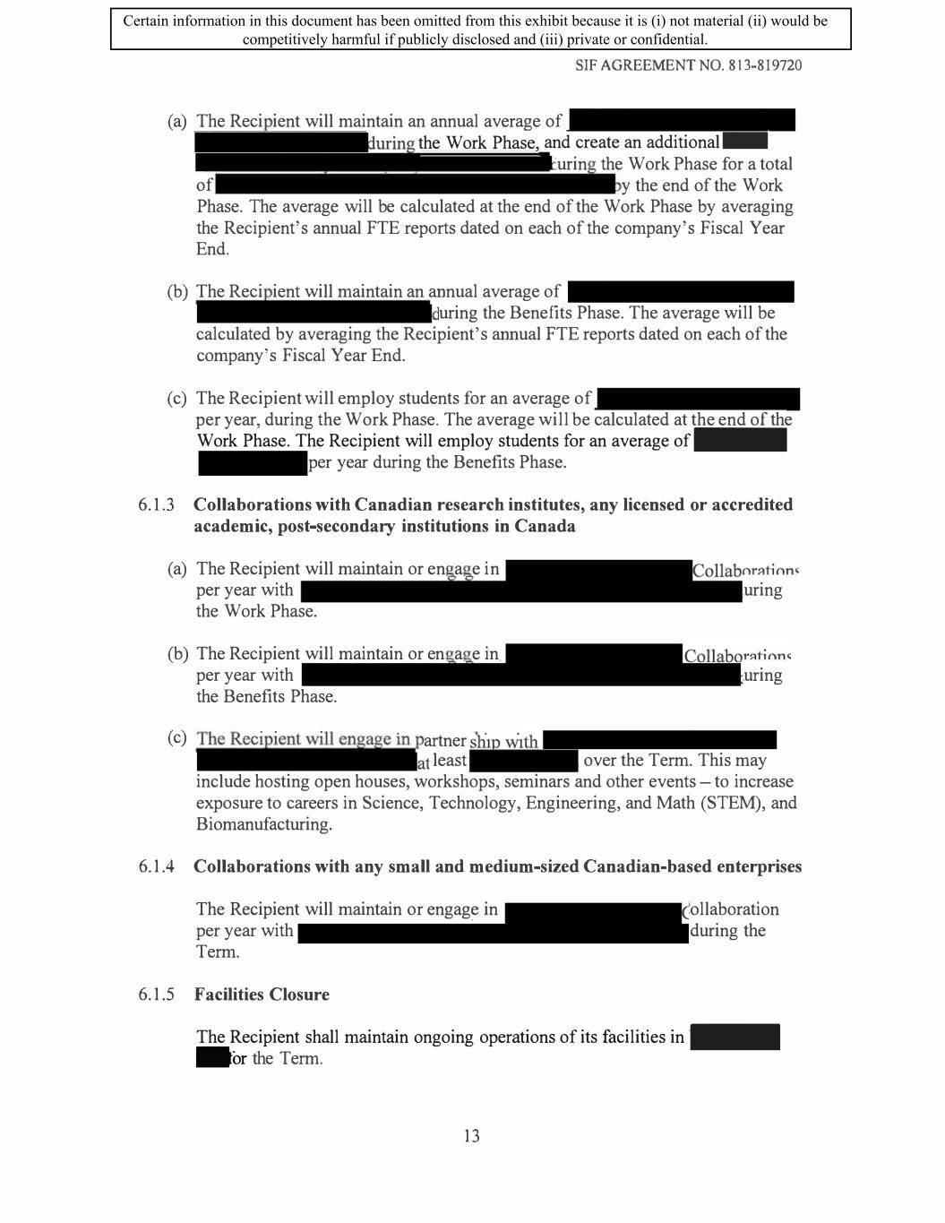 SIF AGREEMENT NO. 813-819720 (f) The Recipient will report to the Minister through the Annual Performance Benefits Report on progress achieved regarding its equity, diversity, and inclusion plan, including updates on progress made against the targets for the duration of the Term. 6.1.10 Reduction of Environmental Impacts (a) The Recipient will commit to the following: a. The Recipient will use reasonable commercial efforts to integrate environmental solutions into their Canadian operations ( e.g. divert solid waste from landfill, reduce fresh water usage, increase plant efficiency, conserve renewable and non-renewable resources etc.) b. The Recipient will make reasonable commercial efforts to ensure its Vancouver facility promotes safety ( e.g. Sustainable laboratory design, operation, and use, including where feasible the usage of zero emission construction materials, heat recovery systems LED lighting, electric charging stations and the reduction of CO2 emissions.) c. The Recipient will commit that the new plant buildings built as part of the Project be designed and manufactured during the Term according to LEED certification standards. (b) The Recipient will report on its progress and achievement against these commitments through the regular project reporting for the Work Phase of the agreement, and will report to The Minister annually on progress achieved against these commitments through the Annual Performance Benefit Report (APBR). 6.1.11 Creation of Environmental Sustainability Plan (a) The Recipient will create an environmental sustainability plan within one (1) year of the Execution Date of the Agreement, to the satisfaction of the Minister. The plan will outline how the Recipient aims to reduce and limit its negative environmental impacts and contribute to Canada's target of achieving a net-zero emissions economy by 2050. (b) The plan should touch on a variety of environmental themes, including but not limited to: measuring and reporting greenhouse gas (GHG) emissions for its Canadian operations, actions to reduce or offset GHG emissions of Canadian operations, climate change risks for the recipient, waste reduction, water management and supply chain greening. The plan must contain baseline figures, identify areas for improvement, present feasible, measurable targets, and establish strategies necessary to achieve outlined goals. ( c) The Recipient must include in the Sustainability Plan any and all commitments made in the Section entitled "Reduction of Environmental Impacts" above. a. Failure to meet any of the commitments made in the Section entitled "Reduction of Environmental Impacts" above may constitute an Event of Default. 16 Certain information in this document has been omitted from this exhibit because it is (i) not material (ii) would be competitively harmful if publicly disclosed and (iii) private or confidential.