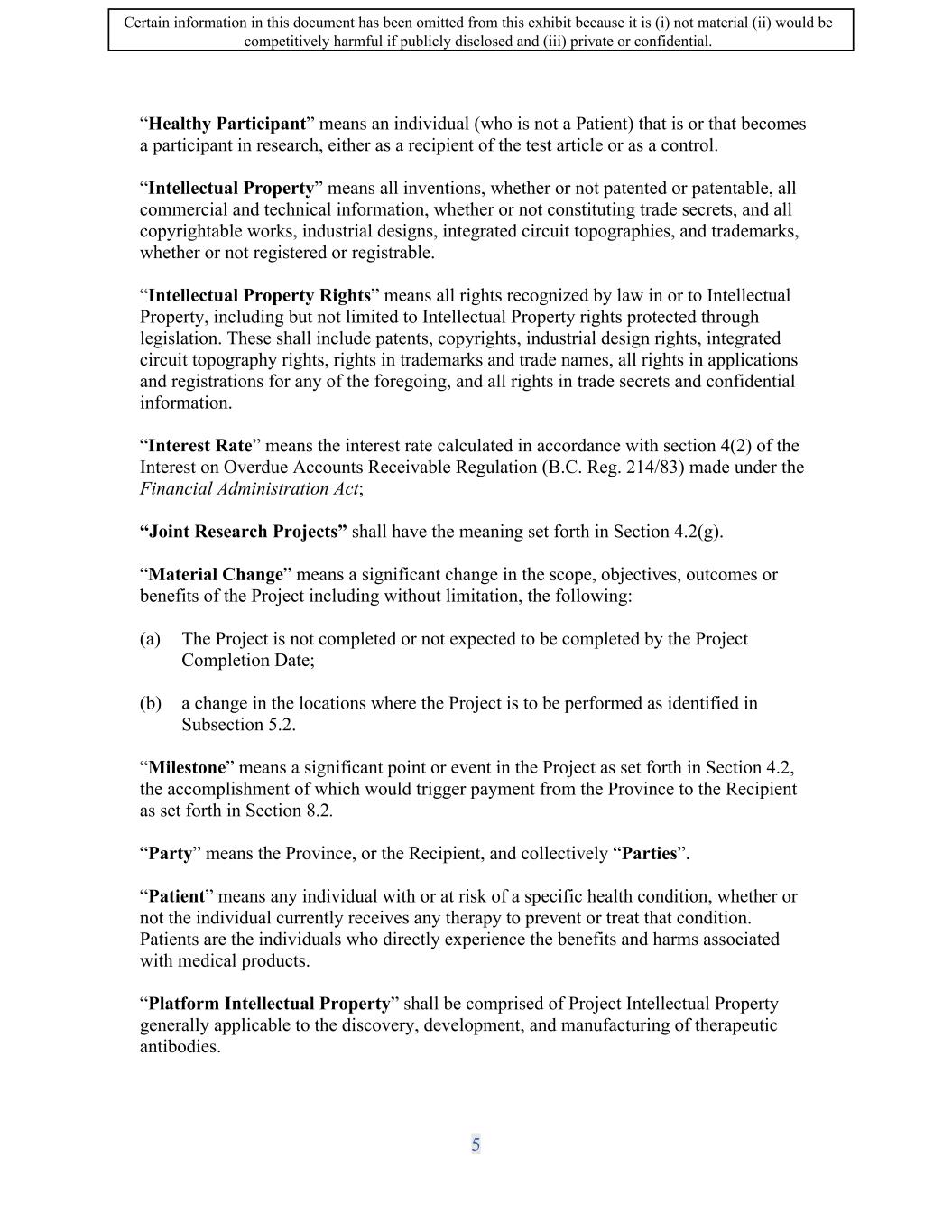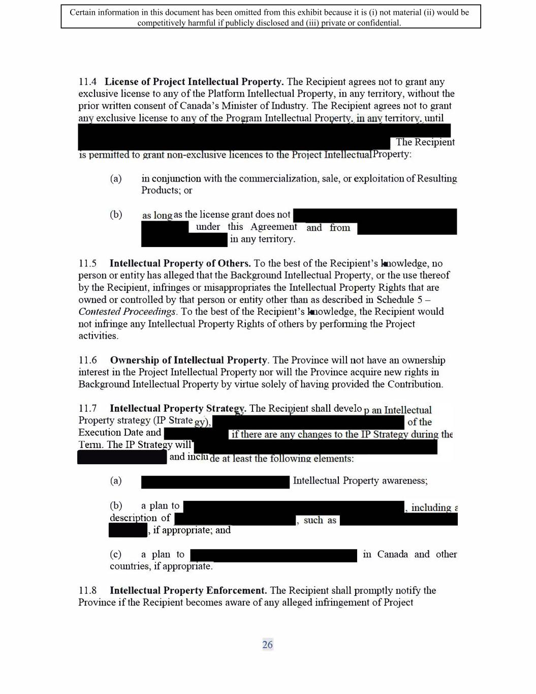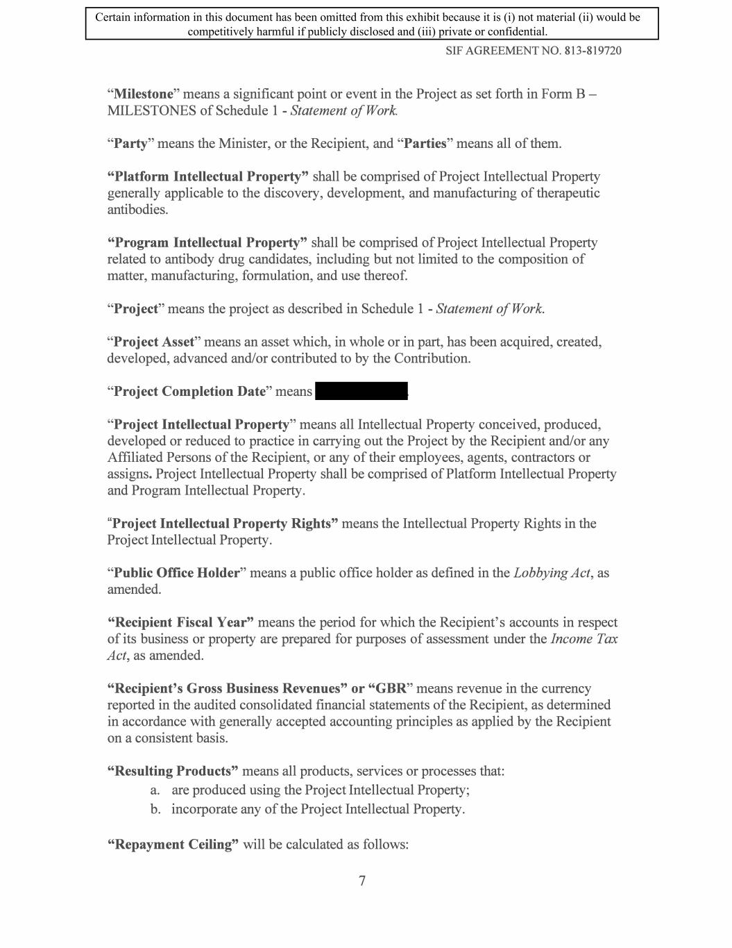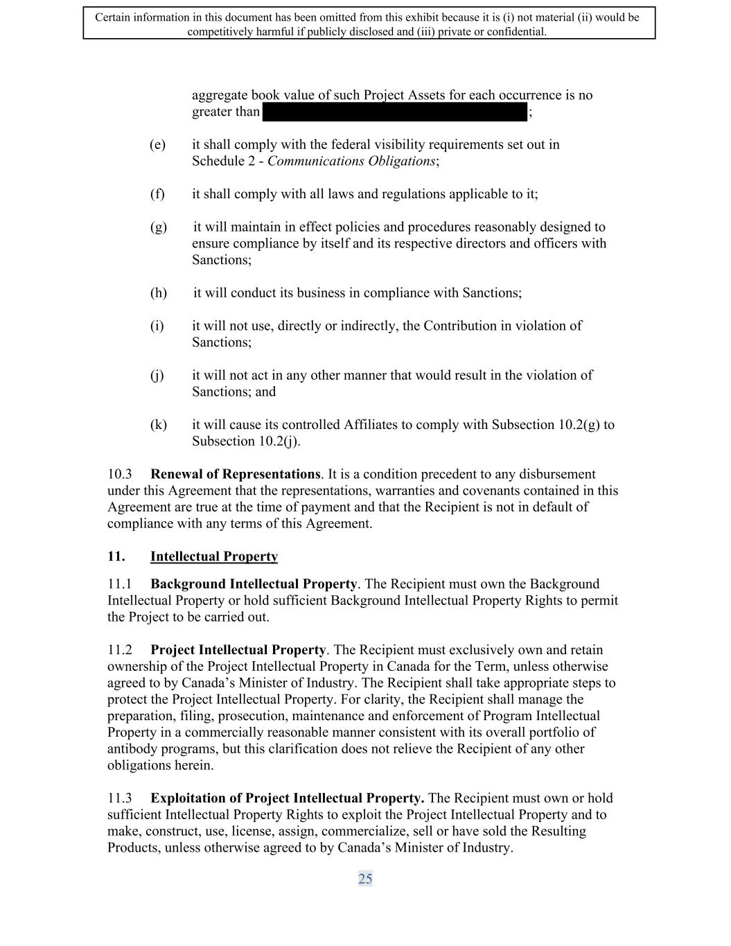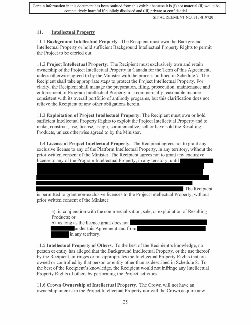 SIF AGREEMENT NO. 813-819720 11. Intellectual Property 11.1 Background Intellectual Property. The Recipient must own the Background Intellectual Property or hold sufficient Background Intellectual Property Rights to permit the Project to be carried out. 11.2 Project Intellectual Property. The Recipient must exclusively own and retain ownership of the Project Intellectual Property in Canada for the Term of this Agreement, unless otherwise agreed to by the Minister with the process outlined in Schedule 7. The Recipient shall take appropriate steps to protect the Project Intellectual Property. For clarity, the Recipient shall manage the preparation, filing, prosecution, maintenance and enforcement of Program Intellectual Property in a commercially reasonable manner consistent with its overall portfolio of antibody programs, but this clarification does not relieve the Recipient of any other obligations herein. 11.3 Exploitation of Project Intellectual Property. The Recipient must own or hold sufficient Intellectual Property Rights to exploit the Project Intellectual Property and to make, construct, use, license, assign, commercialize, sell or have sold the Resulting Products, unless otherwise agreed to by the Minister. 11.4 License of Project Intellectual Property. The Recipient agrees not to grant any exclusive license to any of the Platform Intellectual Property, in any territory, without the prior written consent of the Minister. The Recipient agrees not to grant any exclusive license to any of the Program Intellectual Property, in any territory, until The Recipient is permitted to grant non-exclusive licences to the Project Intellectual Property, without prior written consent of the Minister: a) in conjunction with the commercialisation, sale, or exploitation of Resulting Products; or b) as long as the licence grant does not -under this Agreement and from in any territory. 11.5 Intellectual Property of Others. To the best of the Recipient's knowledge, no person or entity has alleged that the Background Intellectual Property, or the use thereof by the Recipient, infringes or misappropriates the Intellectual Property Rights that are owned or controlled by that person or entity other than as described in Schedule 8. To the best of the Recipient's knowledge, the Recipient would not infringe any Intellectual Property Rights of others by performing the Project activities. 11.6 Crown Ownership of Intellectual Property. The Crown will not have an ownership interest in the Project Intellectual Property nor will the Crown acquire new 25 Certain information in this document has been omitted from this exhibit because it is (i) not material (ii) would be competitively harmful if publicly disclosed and (iii) private or confidential.