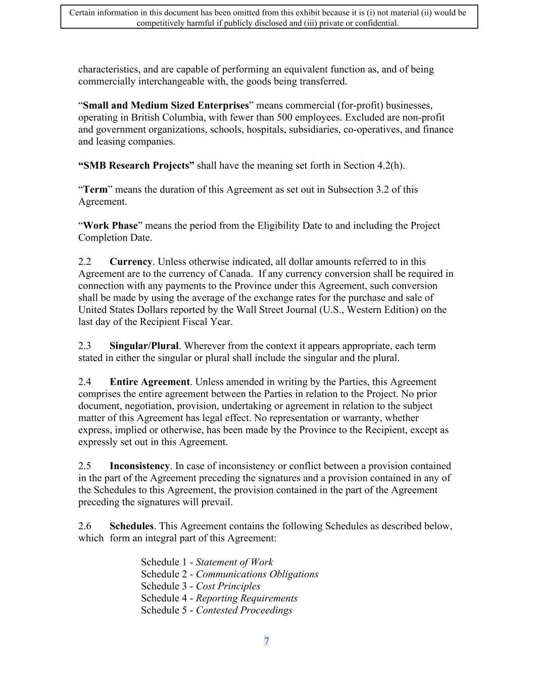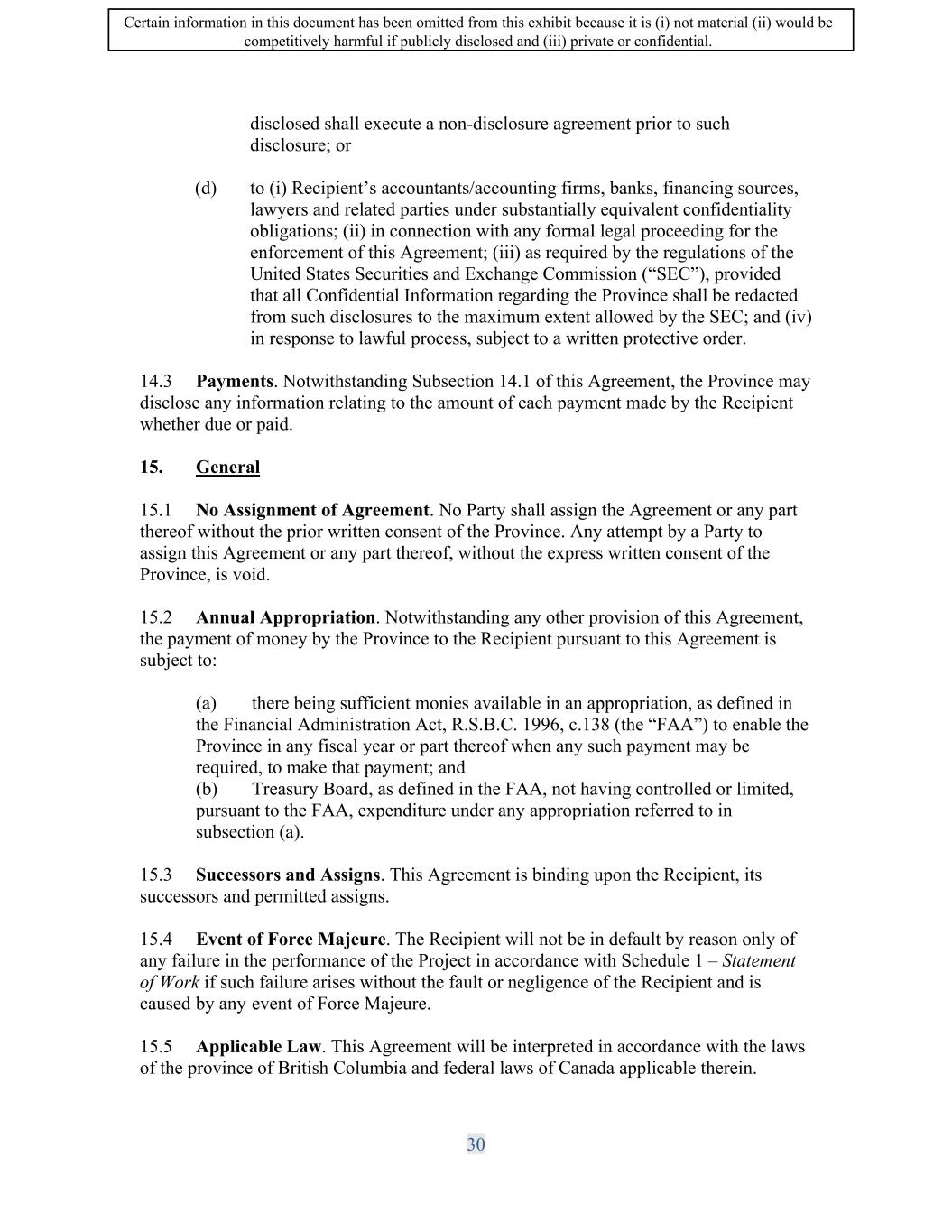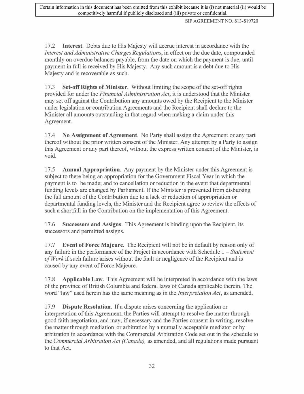SIF AGREEMENT NO. 813-819720 17.2 Interest. Debts due to His Majesty will accrue interest in accordance with the Interest and Administrative Charges Regulations, in effect on the due date, compounded monthly on overdue balances payable, from the date on which the payment is due, until payment in full is received by His Majesty. Any such amount is a debt due to His Majesty and is recoverable as such. 17.3 Set-off Rights of Minister. Without limiting the scope of the set-off rights provided for under the Financial Administration Act, it is understood that the Minister may set off against the Contribution any amounts owed by the Recipient to the Minister under legislation or contribution Agreements and the Recipient shall declare to the Minister all amounts outstanding in that regard when making a claim under this Agreement. 17.4 No Assignment of Agreement. No Party shall assign the Agreement or any part thereof without the prior written consent of the Minister. Any attempt by a Party to assign this Agreement or any part thereof, without the express written consent of the Minister, is void. 17 .5 Annual Appropriation. Any payment by the Minister under this Agreement is subject to there being an appropriation for the Government Fiscal Year in which the payment is to be made; and to cancellation or reduction in the event that departmental funding levels are changed by Parliament. If the Minister is prevented from disbursing the full amount of the Contribution due to a lack or reduction of appropriation or departmental funding levels, the Minister and the Recipient agree to review the effects of such a shortfall in the Contribution on the implementation of this Agreement. 17.6 Successors and Assigns. This Agreement is binding upon the Recipient, its successors and permitted assigns. 17.7 Event of Force Majeure. The Recipient will not be in default by reason only of any failure in the performance of the Project in accordance with Schedule 1 -Statement of Work if such failure arises without the fault or negligence of the Recipient and is caused by any event of Force Majeure. 17.8 Applicable Law. This Agreement will be interpreted in accordance with the laws of the province of British Columbia and federal laws of Canada applicable therein. The word "law" used herein has the same meaning as in the Interpretation Act, as amended. 17 .9 Dispute Resolution. If a dispute arises concerning the application or interpretation of this Agreement, the Parties will attempt to resolve the matter through good faith negotiation, and may, if necessary and the Parties consent in writing, resolve the matter through mediation or arbitration by a mutually acceptable mediator or by arbitration in accordance with the Commercial Arbitration Code set out in the schedule to the Commercial Arbitration Act (Canada), as amended, and all regulations made pursuant to that Act. 32 Certain information in this document has been omitted from this exhibit because it is (i) not material (ii) would be competitively harmful if publicly disclosed and (iii) private or confidential.