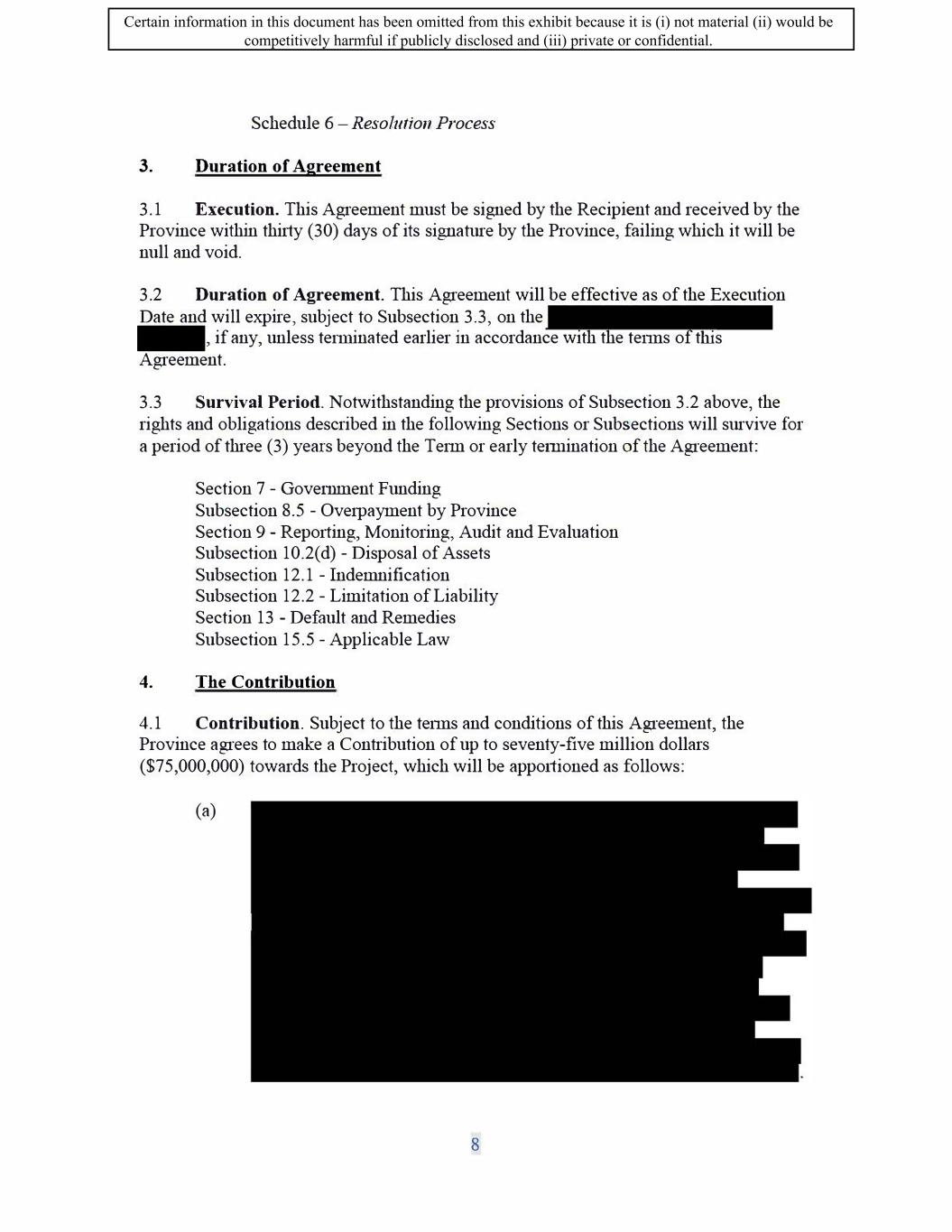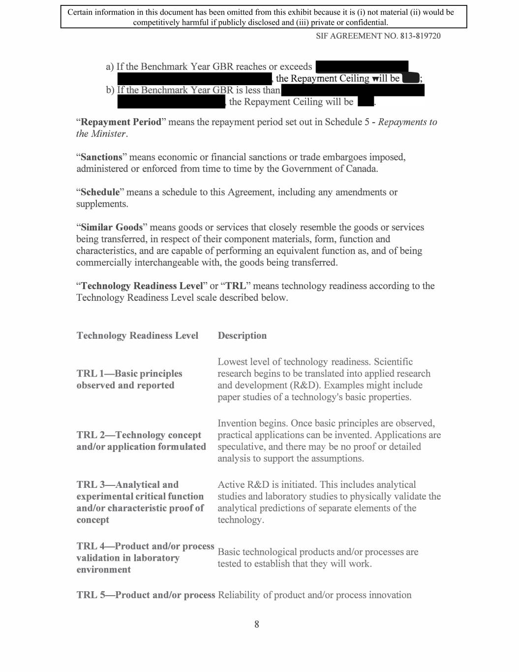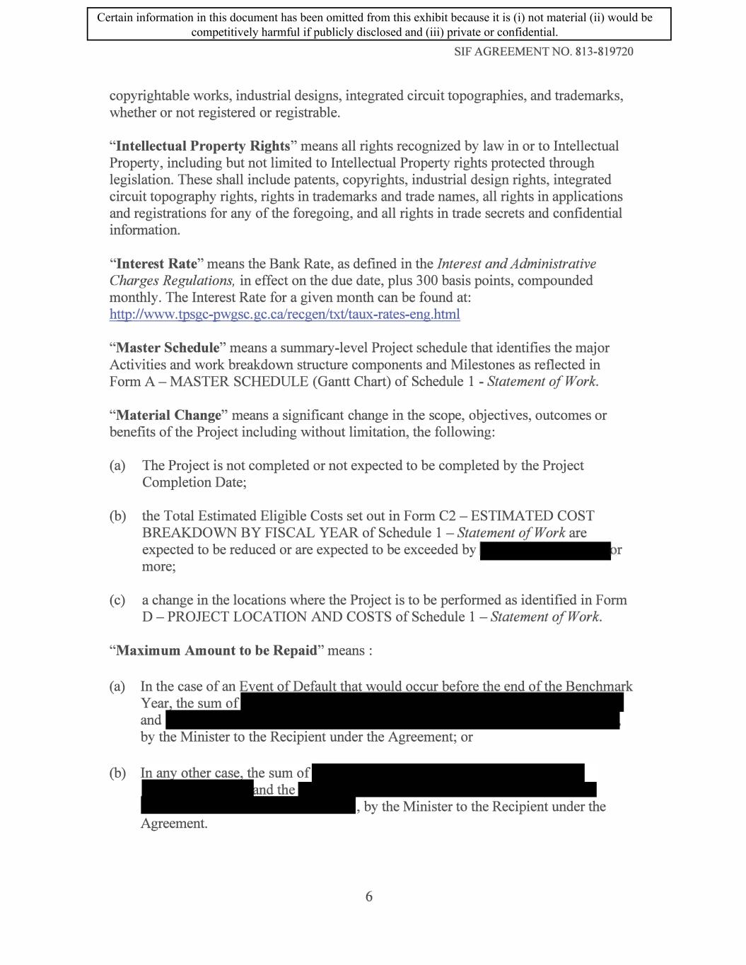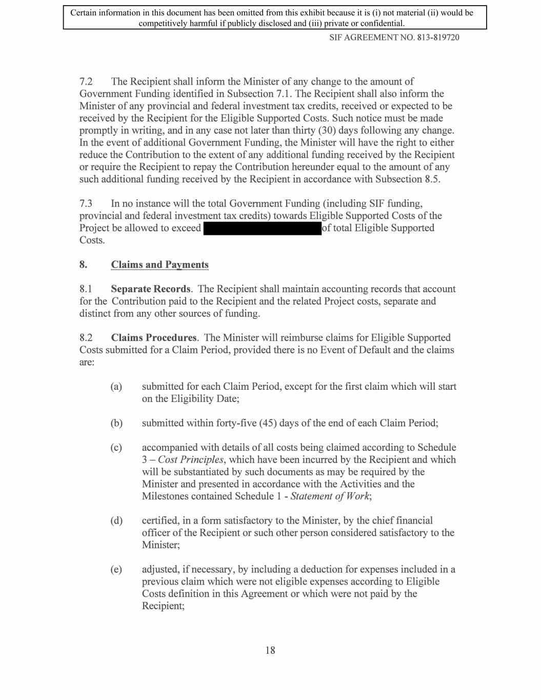 SIF AGREEMENT NO. 813-819720 7 .2 The Recipient shall inform the Minister of any change to the amount of Government Funding identified in Subsection 7 .1. The Recipient shall also inform the Minister of any provincial and federal investment tax credits, received or expected to be received by the Recipient for the Eligible Supported Costs. Such notice must be made promptly in writing, and in any case not later than thirty (30) days following any change. In the event of additional Government Funding, the Minister will have the right to either reduce the Contribution to the extent of any additional funding received by the Recipient or require the Recipient to repay the Contribution hereunder equal to the amount of any such additional funding received by the Recipient in accordance with Subsection 8.5. 7.3 In no instance will the total Government Funding (including SIF funding, provincial and federal investment tax credits) towards Eligible Supported Costs of the Project be allowed to exceed of total Eligible Supported Costs. 8. Claims and Payments 8.1 Separate Records. The Recipient shall maintain accounting records that account for the Contribution paid to the Recipient and the related Project costs, separate and distinct from any other sources of funding. 8.2 Claims Procedures. The Minister will reimburse claims for Eligible Supported Costs submitted for a Claim Period, provided there is no Event of Default and the claims are: (a) submitted for each Claim Period, except for the first claim which will start on the Eligibility Date; (b) submitted within forty-five (45) days of the end of each Claim Period; ( c) accompanied with details of all costs being claimed according to Schedule 3 - Cost Principles, which have been incurred by the Recipient and which will be substantiated by such documents as may be required by the Minister and presented in accordance with the Activities and the Milestones contained Schedule 1 - Statement of Work; (d) certified, in a form satisfactory to the Minister, by the chief financial officer of the Recipient or such other person considered satisfactory to the Minister; ( e) adjusted, if necessary, by including a deduction for expenses included in a previous claim which were not eligible expenses according to Eligible Costs definition in this Agreement or which were not paid by the Recipient; 18 Certain information in this document has been omitted from this exhibit because it is (i) not material (ii) would be competitively harmful if publicly disclosed and (iii) private or confidential.