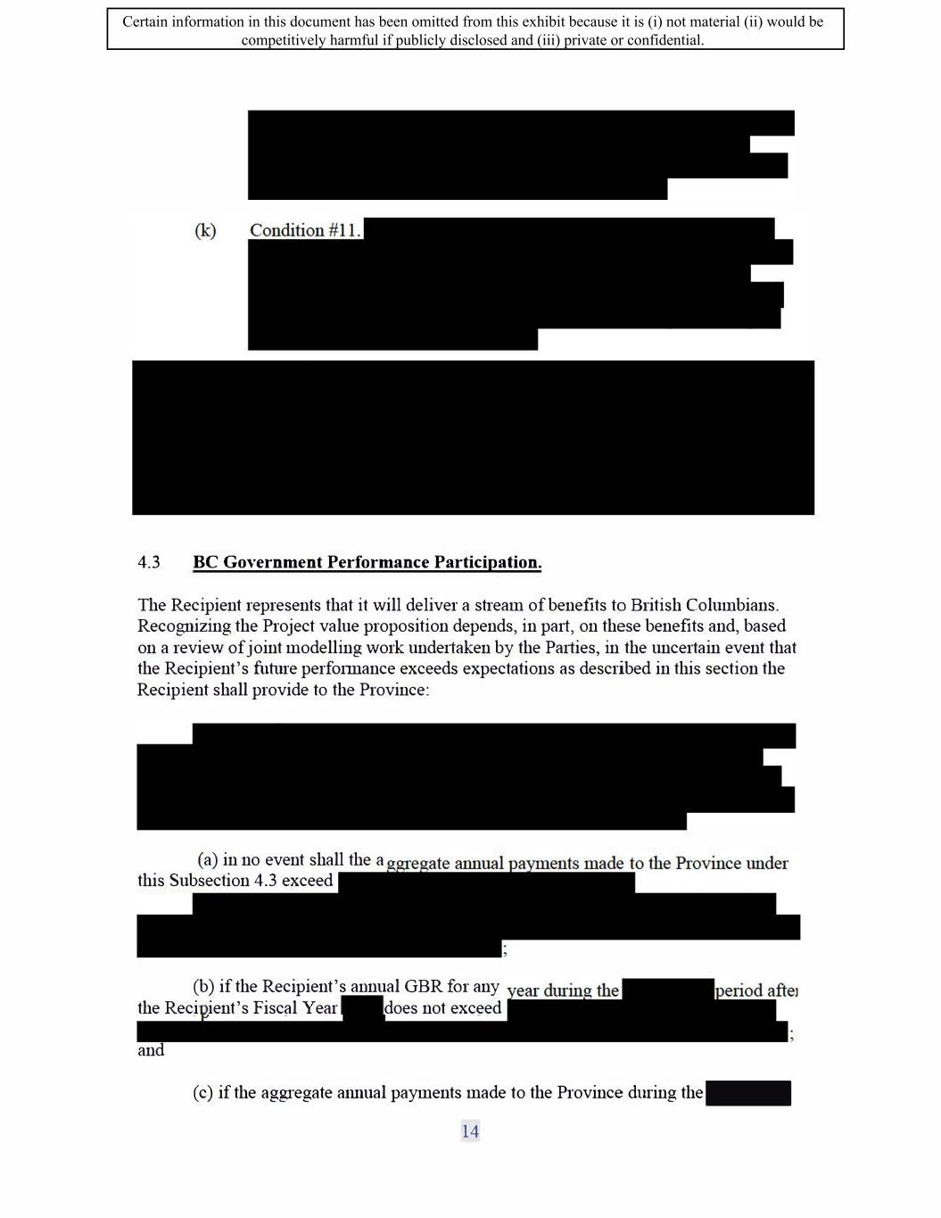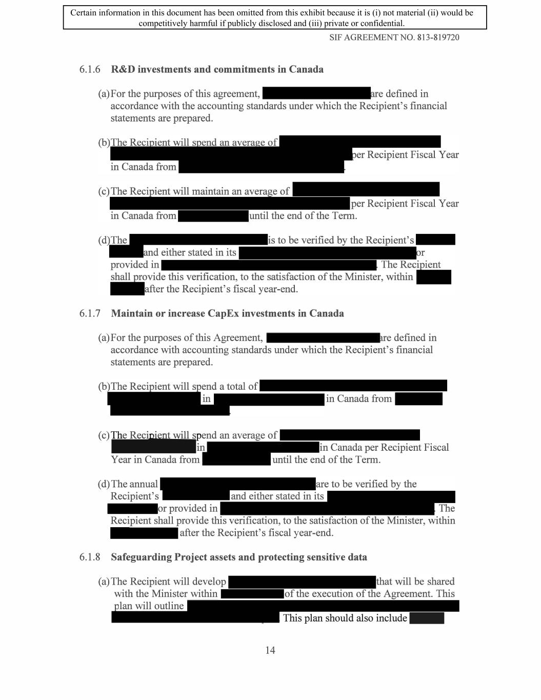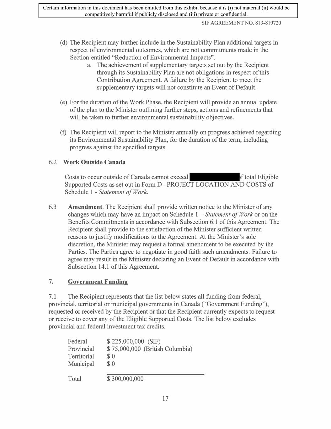 SIF AGREEMENT NO. 813-819720 ( d) The Recipient may further include in the Sustainability Plan additional targets in respect of environmental outcomes, which are not commitments made in the Section entitled "Reduction of Environmental Impacts". a. The achievement of supplementary targets set out by the Recipient through its Sustainability Plan are not obligations in respect of this Contribution Agreement. A failure by the Recipient to meet the supplementary targets will not constitute an Event of Default. (e) For the duration of the Work Phase, the Recipient will provide an annual update of the plan to the Minister outlining further steps, actions and refinements that will be taken to further environmental sustainability objectives. (f) The Recipient will report to the Minister annually on progress achieved regarding its Environmental Sustainability Plan, for the duration of the term, including progress against the specified targets. 6.2 Work Outside Canada Costs to occur outside of Canada cannot exceed f total Eligible Supported Costs as set out in Form D -PROJECT LOCATION AND COSTS of Schedule 1 - Statement of Work. 6.3 Amendment. The Recipient shall provide written notice to the Minister of any changes which may have an impact on Schedule 1 - Statement of Work or on the Benefits Commitments in accordance with Subsection 6.1 of this Agreement. The Recipient shall provide to the satisfaction of the Minister sufficient written reasons to justify modifications to the Agreement. At the Minister's sole discretion, the Minister may request a formal amendment to be executed by the Parties. The Parties agree to negotiate in good faith such amendments. Failure to agree may result in the Minister declaring an Event of Default in accordance with Subsection 14.1 of this Agreement. 7. Government Funding 7 .1 The Recipient represents that the list below states all funding from federal, provincial, territorial or municipal governments in Canada ("Government Funding"), requested or received by the Recipient or that the Recipient currently expects to request or receive to cover any of the Eligible Supported Costs. The list below excludes provincial and federal investment tax credits. Federal Provincial Territorial Municipal Total $ 225,000,000 (SIF) $ 75,000,000 (British Columbia) $0 $0 $ 300,000,000 17 Certain information in this document has been omitted from this exhibit because it is (i) not material (ii) would be competitively harmful if publicly disclosed and (iii) private or confidential.