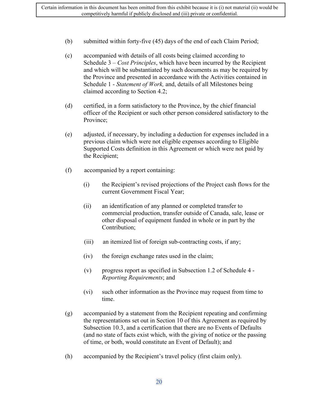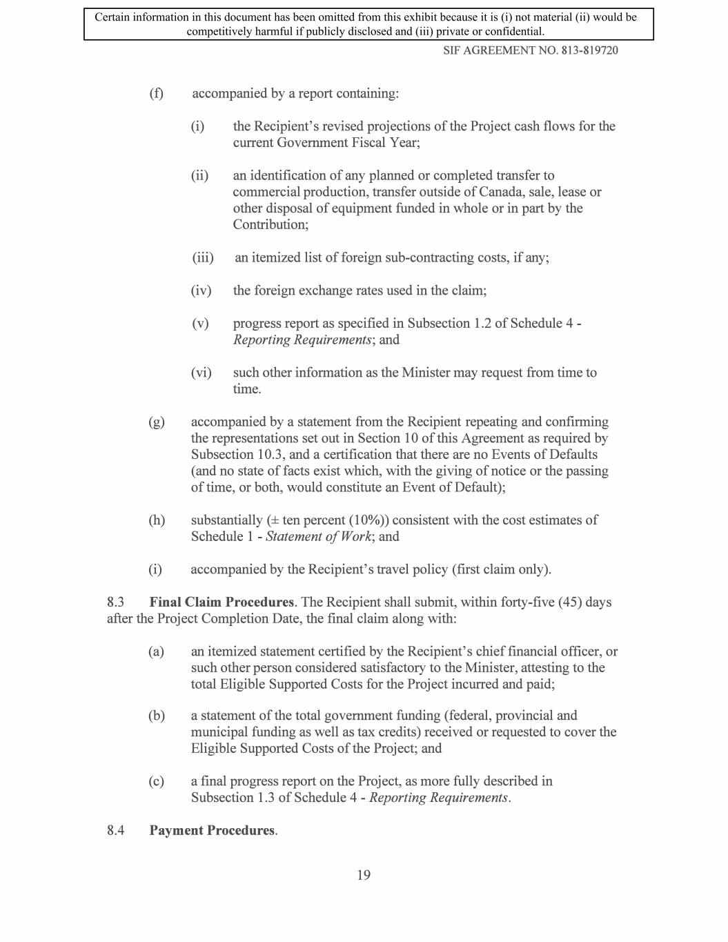 (f) accompanied by a report containing: SIF AGREEMENT NO. 813-819720 (i) the Recipient's revised projections of the Project cash flows for the current Government Fiscal Year; (ii) an identification of any planned or completed transfer to commercial production, transfer outside of Canada, sale, lease or other disposal of equipment funded in whole or in part by the Contribution; (iii) an itemized list of foreign sub-contracting costs, if any; (iv) the foreign exchange rates used in the claim; (v) progress report as specified in Subsection 1.2 of Schedule 4 - Reporting Requirements; and (vi) such other information as the Minister may request from time to time. (g) accompanied by a statement from the Recipient repeating and confirming the representations set out in Section 10 of this Agreement as required by Subsection 10.3, and a certification that there are no Events of Defaults (and no state of facts exist which, with the giving of notice or the passing of time, or both, would constitute an Event of Default); (h) substantially(± ten percent (10%)) consistent with the cost estimates of Schedule 1 - Statement of Work; and (i) accompanied by the Recipient's travel policy (first claim only). 8.3 Final Claim Procedures. The Recipient shall submit, within forty-five (45) days after the Project Completion Date, the final claim along with: (a) an itemized statement certified by the Recipient's chief financial officer, or such other person considered satisfactory to the Minister, attesting to the total Eligible Supported Costs for the Project incurred and paid; (b) a statement of the total government funding ( federal, provincial and municipal funding as well as tax credits) received or requested to cover the Eligible Supported Costs of the Project; and ( c) a final progress report on the Project, as more fully described in Subsection 1.3 of Schedule 4 - Reporting Requirements. 8.4 Payment Procedures. 19 Certain information in this document has been omitted from this exhibit because it is (i) not material (ii) would be competitively harmful if publicly disclosed and (iii) private or confidential.
