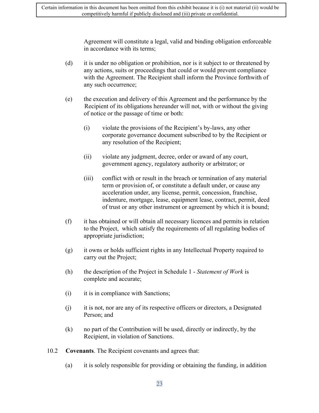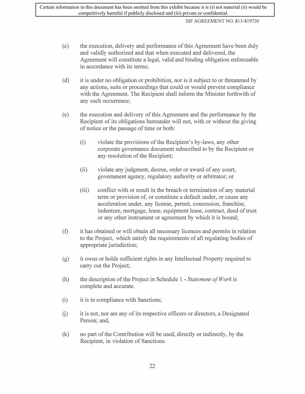 SIF AGREEMENT NO. 813-819720 ( c) the execution, delivery and performance of this Agreement have been duly and validly authorized and that when executed and delivered, the Agreement will constitute a legal, valid and binding obligation enforceable in accordance with its terms; (d) it is under no obligation or prohibition, nor is it subject to or threatened by any actions, suits or proceedings that could or would prevent compliance with the Agreement. The Recipient shall inform the Minister forthwith of any such occurrence; ( e) the execution and delivery of this Agreement and the performance by the Recipient of its obligations hereunder will not, with or without the giving of notice or the passage of time or both: (i) violate the provisions of the Recipient's by-laws, any other corporate governance document subscribed to by the Recipient or any resolution of the Recipient; (ii) violate any judgment, decree, order or award of any court, government agency, regulatory authority or arbitrator; or (iii) conflict with or result in the breach or termination of any material term or provision of, or constitute a default under, or cause any acceleration under, any license, permit, concession, franchise, indenture, mortgage, lease, equipment lease, contract, deed of trust or any other instrument or agreement by which it is bound; (f) it has obtained or will obtain all necessary licences and permits in relation to the Project, which satisfy the requirements of all regulating bodies of appropriate jurisdiction; (g) it owns or holds sufficient rights in any Intellectual Property required to carry out the Project; (h) the description of the Project in Schedule 1 - Statement of Work is complete and accurate. (i) it is in compliance with Sanctions; G) it is not, nor are any of its respective officers or directors, a Designated Person; and, (k) no part of the Contribution will be used, directly or indirectly, by the Recipient, in violation of Sanctions. 22 Certain information in this document has been omitted from this exhibit because it is (i) not material (ii) would be competitively harmful if publicly disclosed and (iii) private or confidential.
