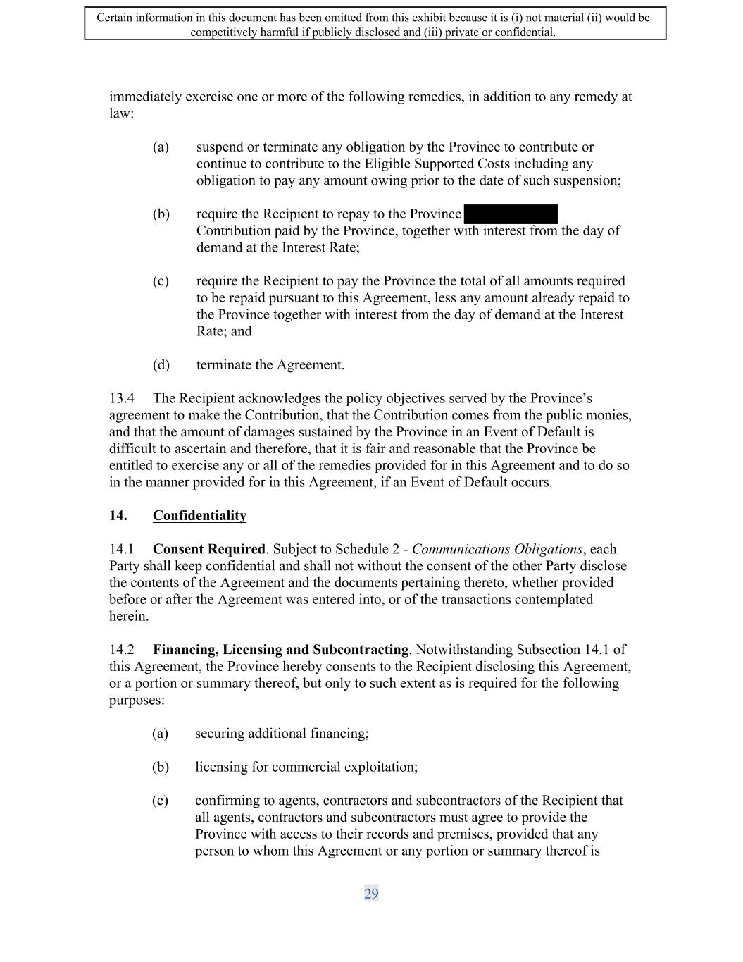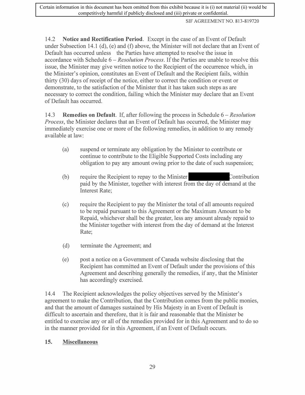 SIF AGREEMENT NO. 813-819720 14.2 Notice and Rectification Period. Except in the case of an Event of Default under Subsection 14.1 (d), (e) and (f) above, the Minister will not declare that an Event of Default has occurred unless the Parties have attempted to resolve the issue in accordance with Schedule 6 -Resolution Process. If the Parties are unable to resolve this issue, the Minister may give written notice to the Recipient of the occurrence which, in the Minister's opinion, constitutes an Event of Default and the Recipient fails, within thirty (30) days ofreceipt of the notice, either to correct the condition or event or demonstrate, to the satisfaction of the Minister that it has taken such steps as are necessary to correct the condition, failing which the Minister may declare that an Event of Default has occurred. 14.3 Remedies on Default. If, after following the process in Schedule 6-Resolution Process, the Minister declares that an Event of Default has occurred, the Minister may immediately exercise one or more of the following remedies, in addition to any remedy available at law: (a) suspend or terminate any obligation by the Minister to contribute or continue to contribute to the Eligible Supported Costs including any obligation to pay any amount owing prior to the date of such suspension; (b) require the Recipient to repay to the Minister ontribution paid by the Minister, together with interest from the day of demand at the Interest Rate; ( c) require the Recipient to pay the Minister the total of all amounts required to be repaid pursuant to this Agreement or the Maximum Amount to be Repaid, whichever shall be the greater, less any amount already repaid to the Minister together with interest from the day of demand at the Interest Rate; ( d) terminate the Agreement; and ( e) post a notice on a Government of Canada website disclosing that the Recipient has committed an Event of Default under the provisions of this Agreement and describing generally the remedies, if any, that the Minister has accordingly exercised. 14.4 The Recipient acknowledges the policy objectives served by the Minister's agreement to make the Contribution, that the Contribution comes from the public monies, and that the amount of damages sustained by His Majesty in an Event of Default is difficult to ascertain and therefore, that it is fair and reasonable that the Minister be entitled to exercise any or all of the remedies provided for in this Agreement and to do so in the manner provided for in this Agreement, if an Event of Default occurs. 15. Miscellaneous 29 Certain information in this document has been omitted from this exhibit because it is (i) not material (ii) would be competitively harmful if publicly disclosed and (iii) private or confidential.