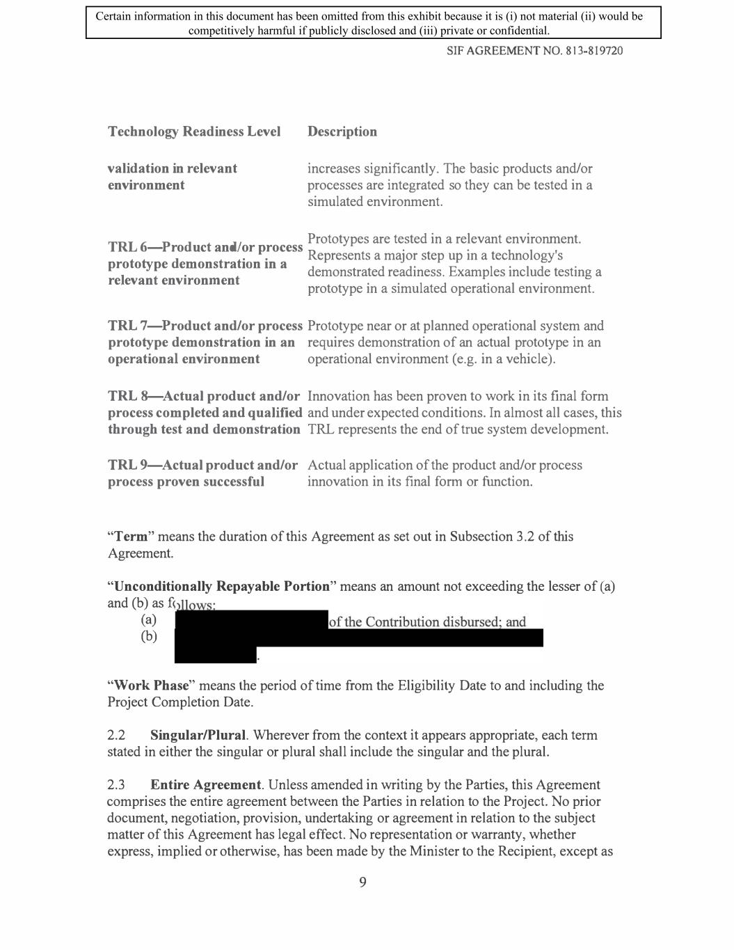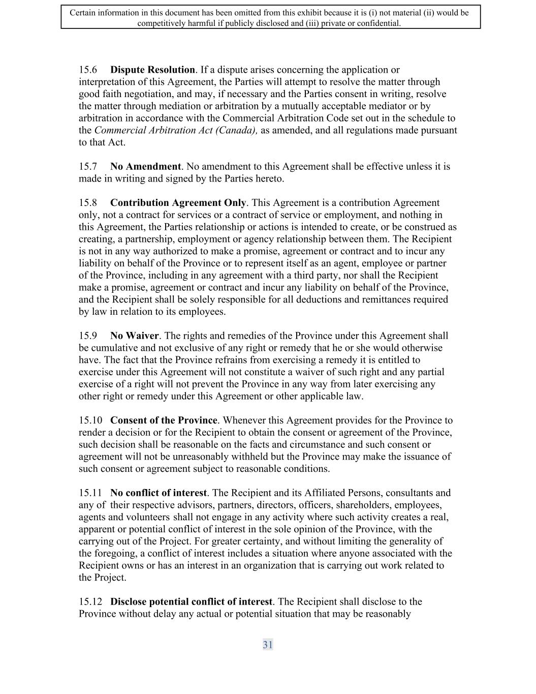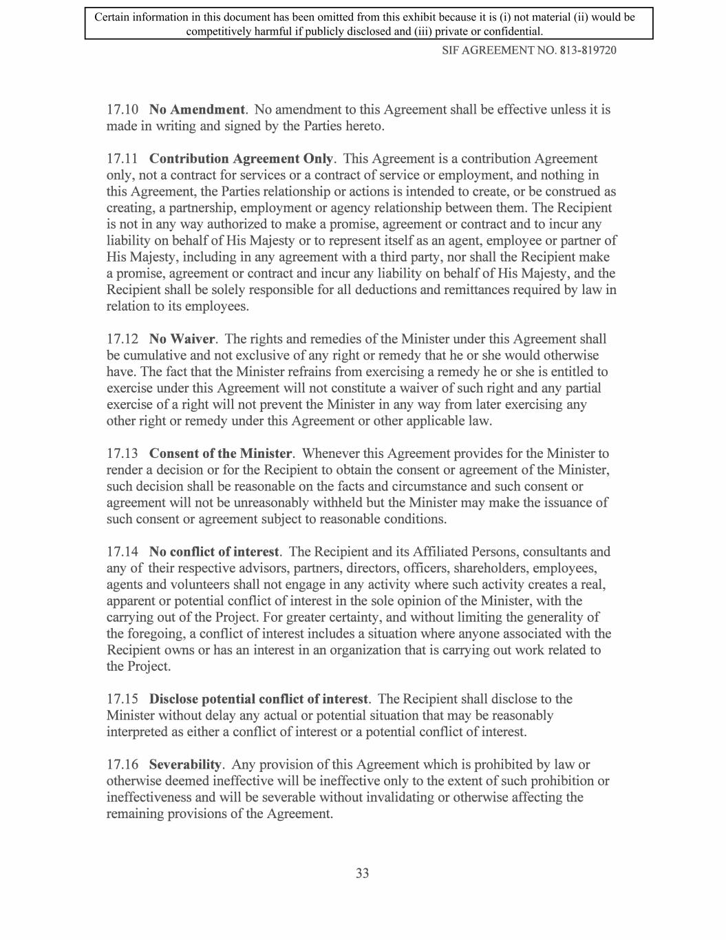 SIF AGREEMENT NO. 813-819720 17.10 No Amendment. No amendment to this Agreement shall be effective unless it is made in writing and signed by the Parties hereto. 17 .11 Contribution Agreement Only. This Agreement is a contribution Agreement only, not a contract for services or a contract of service or employment, and nothing in this Agreement, the Parties relationship or actions is intended to create, or be construed as creating, a partnership, employment or agency relationship between them. The Recipient is not in any way authorized to make a promise, agreement or contract and to incur any liability on behalf of His Majesty or to represent itself as an agent, employee or partner of His Majesty, including in any agreement with a third party, nor shall the Recipient make a promise, agreement or contract and incur any liability on behalf of His Majesty, and the Recipient shall be solely responsible for all deductions and remittances required by law in relation to its employees. 17.12 No Waiver. The rights and remedies of the Minister under this Agreement shall be cumulative and not exclusive of any right or remedy that he or she would otherwise have. The fact that the Minister refrains from exercising a remedy he or she is entitled to exercise under this Agreement will not constitute a waiver of such right and any partial exercise of a right will not prevent the Minister in any way from later exercising any other right or remedy under this Agreement or other applicable law. 17.13 Consent of the Minister. Whenever this Agreement provides for the Minister to render a decision or for the Recipient to obtain the consent or agreement of the Minister, such decision shall be reasonable on the facts and circumstance and such consent or agreement will not be unreasonably withheld but the Minister may make the issuance of such consent or agreement subject to reasonable conditions. 17.14 No conflict of interest. The Recipient and its Affiliated Persons, consultants and any of their respective advisors, partners, directors, officers, shareholders, employees, agents and volunteers shall not engage in any activity where such activity creates a real, apparent or potential conflict of interest in the sole opinion of the Minister, with the carrying out of the Project. For greater certainty, and without limiting the generality of the foregoing, a conflict of interest includes a situation where anyone associated with the Recipient owns or has an interest in an organization that is carrying out work related to the Project. 17 .15 Disclose potential conflict of interest. The Recipient shall disclose to the Minister without delay any actual or potential situation that may be reasonably interpreted as either a conflict of interest or a potential conflict of interest. 17 .16 Severability. Any provision of this Agreement which is prohibited by law or otherwise deemed ineffective will be ineffective only to the extent of such prohibition or ineffectiveness and will be severable without invalidating or otherwise affecting the remaining provisions of the Agreement. 33 Certain information in this document has been omitted from this exhibit because it is (i) not material (ii) would be competitively harmful if publicly disclosed and (iii) private or confidential.