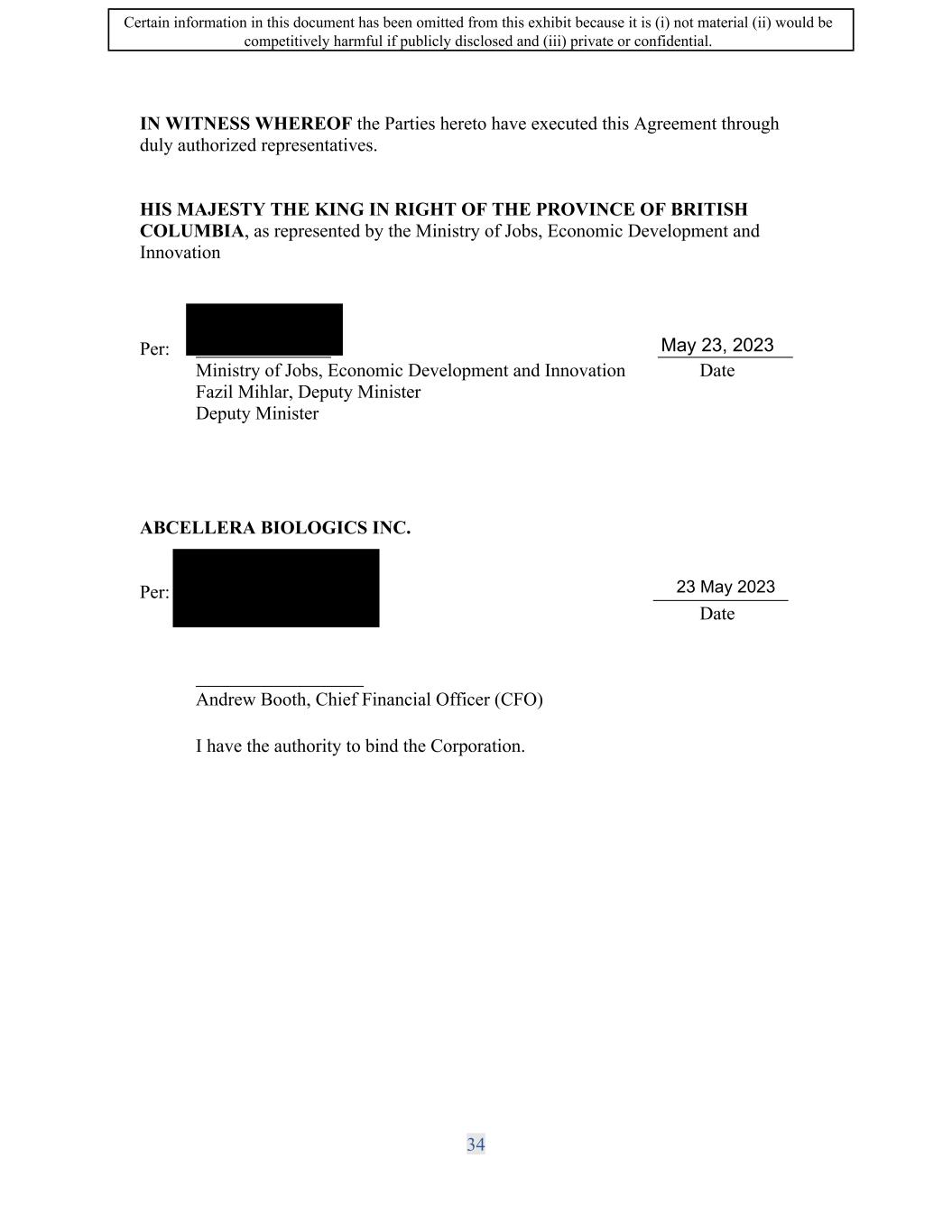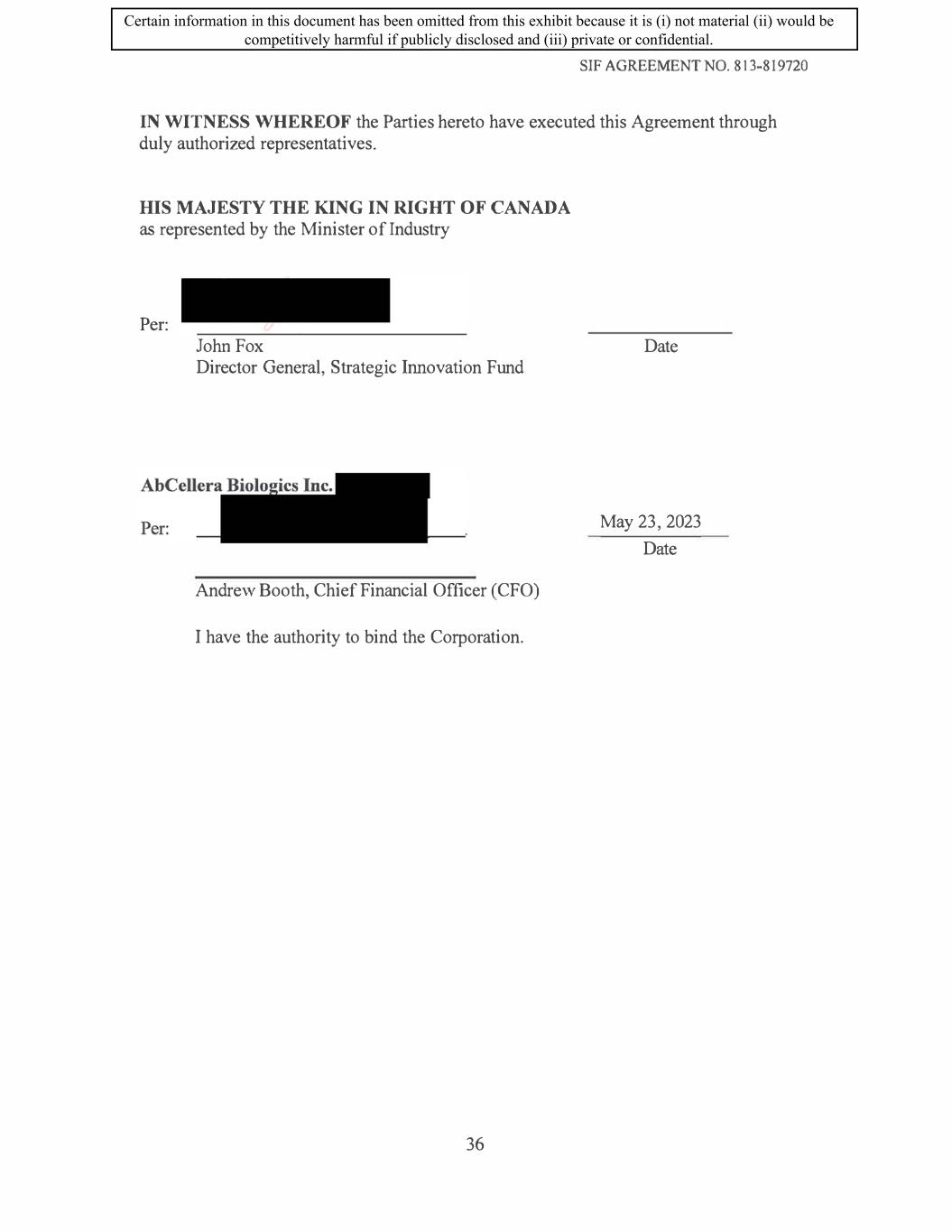 SIF AGREEMENT NO. 813-819720 IN WITNESS WHEREOF the Parties hereto have executed this Agreement through duly authorized representatives. ms MAJESTY THE KING IN RIGHT OF CANADA as represented by the Minister of Industry Per: John Fox Director General, Strategic Innovation Fund Andrew Booth, Chief Financial Officer (CFO) I have the authority to bind the Corporation. 36 Date May 23, 2023 Date Certain information in this document has been omitted from this exhibit because it is (i) not material (ii) would be competitively harmful if publicly disclosed and (iii) private or confidential.