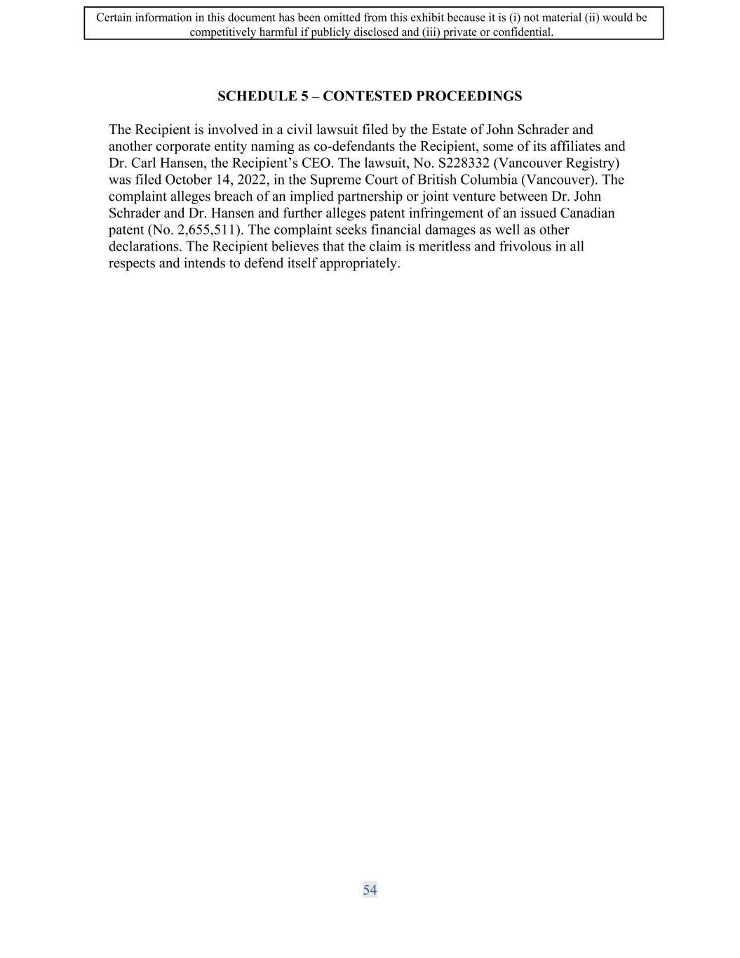 SIF AGREEMENT NO. 813-819720 SCHEDULE 8 - CONTESTED PROCEEDINGS The Recipient is involved in a civil lawsuit filed by the Estate of John Schrader and another corporate entity naming as co-defendants the Recipient, some of its affiliates and Dr. Carl Hansen, the Recipient's CEO. The lawsuit, No. S228332 (Vancouver Registry) was filed October 14, 2022, in the Supreme Court of British Columbia (Vancouver). The complaint alleges breach of an implied partnership or joint venture between Dr. John Schrader and Dr. Hansen and further alleges patent infringement of an issued Canadian patent (No. 2,655,511). The complaint seeks financial damages as well as other declarations. The Recipient believes that the claims are meritless and frivolous in all respects and intends to defend itself appropriately. 72 Certain information in this document has been omitted from this exhibit because it is (i) not material (ii) would be competitively harmful if publicly disclosed and (iii) private or confidential.