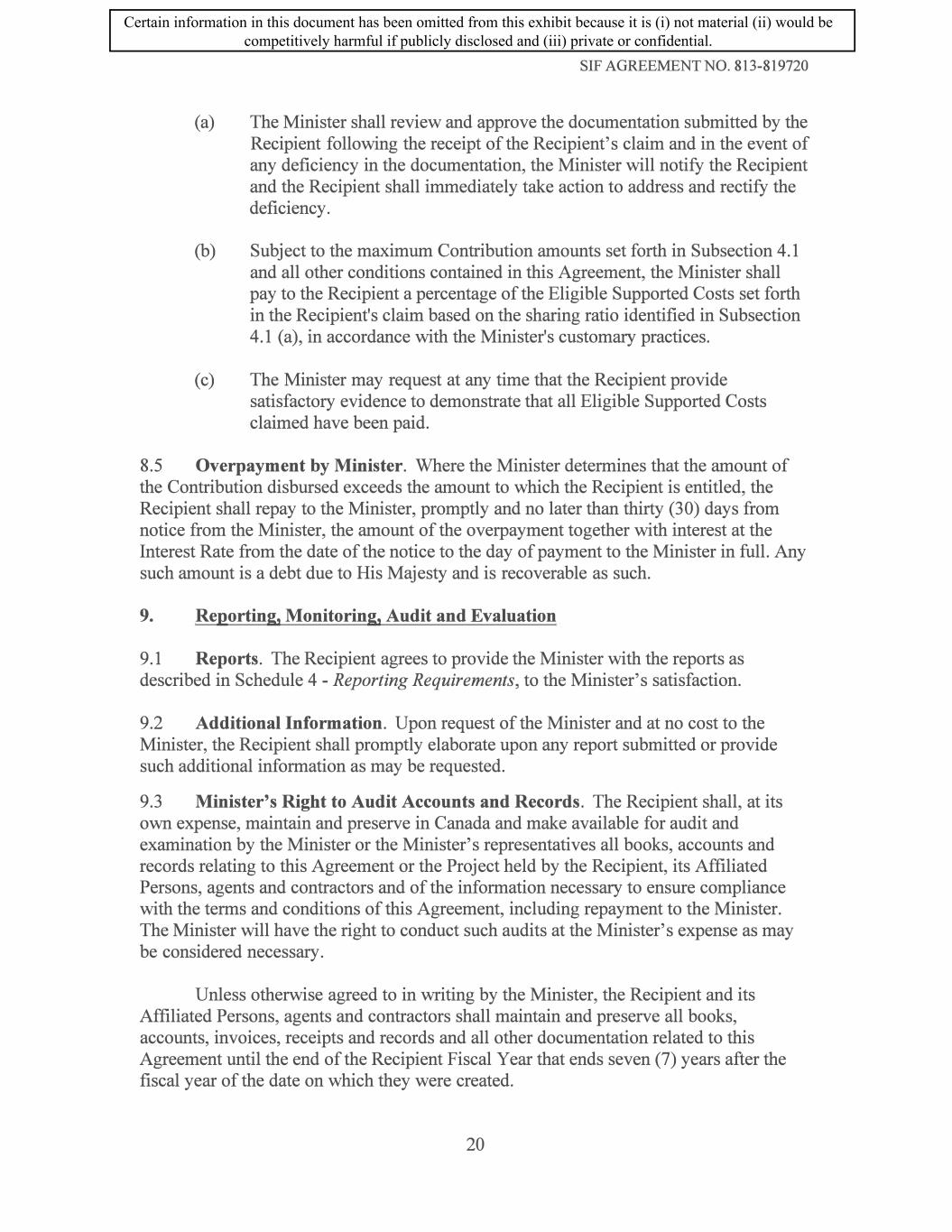 SIF AGREEMENT NO. 813-819720 (a) The Minister shall review and approve the documentation submitted by the Recipient following the receipt of the Recipient's claim and in the event of any deficiency in the documentation, the Minister will notify the Recipient and the Recipient shall immediately take action to address and rectify the deficiency. (b) Subject to the maximum Contribution amounts set forth in Subsection 4.1 and all other conditions contained in this Agreement, the Minister shall pay to the Recipient a percentage of the Eligible Supported Costs set forth in the Recipient's claim based on the sharing ratio identified in Subsection 4.1 (a), in accordance with the Minister's customary practices. ( c) The Minister may request at any time that the Recipient provide satisfactory evidence to demonstrate that all Eligible Supported Costs claimed have been paid. 8.5 Overpayment by Minister. Where the Minister determines that the amount of the Contribution disbursed exceeds the amount to which the Recipient is entitled, the Recipient shall repay to the Minister, promptly and no later than thirty (30) days from notice from the Minister, the amount of the overpayment together with interest at the Interest Rate from the date of the notice to the day of payment to the Minister in full. Any such amount is a debt due to His Majesty and is recoverable as such. 9. Reporting, Monitoring, Audit and Evaluation 9 .1 Reports. The Recipient agrees to provide the Minister with the reports as described in Schedule 4 - Reporting Requirements, to the Minister's satisfaction. 9.2 Additional Information. Upon request of the Minister and at no cost to the Minister, the Recipient shall promptly elaborate upon any report submitted or provide such additional information as may be requested. 9.3 Minister's Right to Audit Accounts and Records. The Recipient shall, at its own expense, maintain and preserve in Canada and make available for audit and examination by the Minister or the Minister's representatives all books, accounts and records relating to this Agreement or the Project held by the Recipient, its Affiliated Persons, agents and contractors and of the information necessary to ensure compliance with the terms and conditions of this Agreement, including repayment to the Minister. The Minister will have the right to conduct such audits at the Minister's expense as may be considered necessary. Unless otherwise agreed to in writing by the Minister, the Recipient and its Affiliated Persons, agents and contractors shall maintain and preserve all books, accounts, invoices, receipts and records and all other documentation related to this Agreement until the end of the Recipient Fiscal Year that ends seven (7) years after the fiscal year of the date on which they were created. 20 Certain information in this document has been omitted from this exhibit because it is (i) not material (ii) would be competitively harmful if publicly disclosed and (iii) private or confidential.