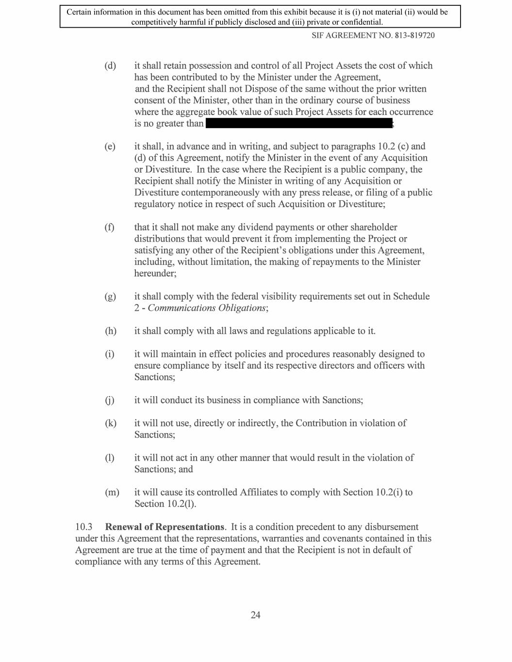 SIF AGREEMENT NO. 813-819720 ( d) it shall retain possession and control of all Project Assets the cost of which has been contributed to by the Minister under the Agreement, and the Recipient shall not Dispose of the same without the prior written consent of the Minister, other than in the ordinary course of business where the aggregate book value of such Project Assets for each occurrence is no greater than (e) it shall, in advance and in writing, and subject to paragraphs 10.2 (c) and ( d) of this Agreement, notify the Minister in the event of any Acquisition or Divestiture. In the case where the Recipient is a public company, the Recipient shall notify the Minister in writing of any Acquisition or Divestiture contemporaneously with any press release, or filing of a public regulatory notice in respect of such Acquisition or Divestiture; (f) that it shall not make any dividend payments or other shareholder distributions that would prevent it from implementing the Project or satisfying any other of the Recipient's obligations under this Agreement, including, without limitation, the making of repayments to the Minister hereunder; (g) it shall comply with the federal visibility requirements set out in Schedule 2 - Communications Obligations; (h) it shall comply with all laws and regulations applicable to it. (i) it will maintain in effect policies and procedures reasonably designed to ensure compliance by itself and its respective directors and officers with Sanctions; G) it will conduct its business in compliance with Sanctions; (k) it will not use, directly or indirectly, the Contribution in violation of Sanctions; (1) it will not act in any other manner that would result in the violation of Sanctions; and (m) it will cause its controlled Affiliates to comply with Section 10.2(i) to Section 10.2(1). 10.3 Renewal of Representations. It is a condition precedent to any disbursement under this Agreement that the representations, warranties and covenants contained in this Agreement are true at the time of payment and that the Recipient is not in default of compliance with any terms of this Agreement. 24 Certain information in this document has been omitted from this exhibit because it is (i) not material (ii) would be competitively harmful if publicly disclosed and (iii) private or confidential.