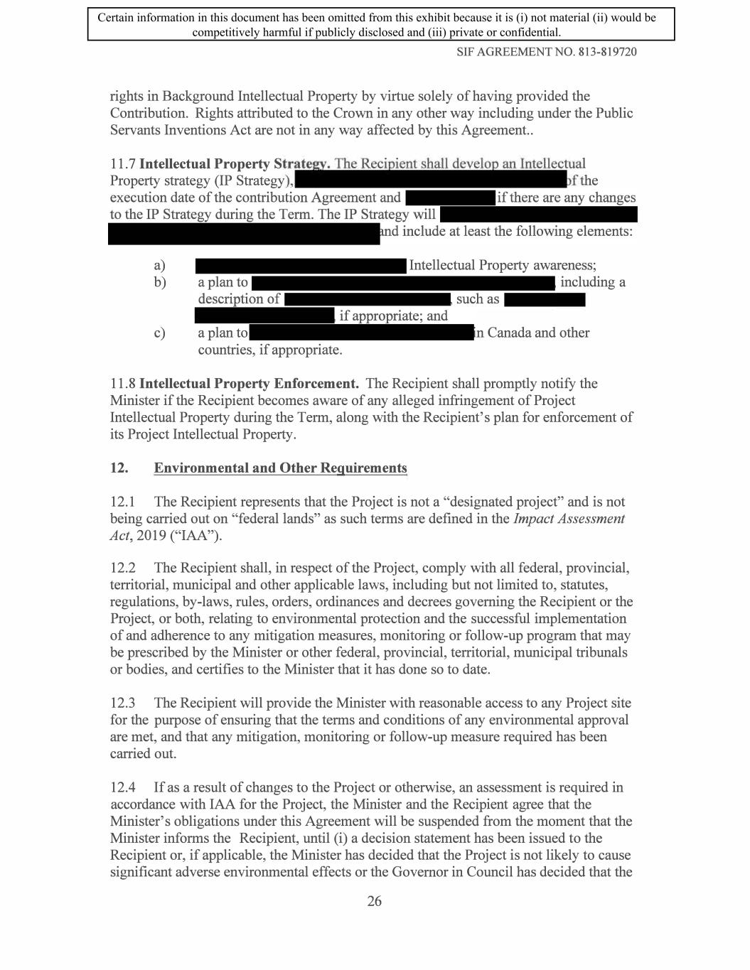 SIF AGREEMENT NO. 813-819720 rights in Background Intellectual Property by virtue solely of having provided the Contribution. Rights attributed to the Crown in any other way including under the Public Servants Inventions Act are not in any way affected by this Agreement.. 11. 7 Intellectual Property S • • 1 Property strategy (IP Strategy he execution date of the contribu a) b) c) a plan to countries, if appropriate. Intellectual Property awareness; including a n Canada and other 11.8 Intellectual Property Enforcement. The Recipient shall promptly notify the Minister if the Recipient becomes aware of any alleged infringement of Project Intellectual Property during the Term, along with the Recipient's plan for enforcement of its Project Intellectual Property. 12. Environmental and Other Requirements 12.1 The Recipient represents that the Project is not a "designated project" and is not being carried out on "federal lands" as such terms are defined in the Impact Assessment Act, 2019 ("IAA"). 12.2 The Recipient shall, in respect of the Project, comply with all federal, provincial, territorial, municipal and other applicable laws, including but not limited to, statutes, regulations, by-laws, rules, orders, ordinances and decrees governing the Recipient or the Project, or both, relating to environmental protection and the successful implementation of and adherence to any mitigation measures, monitoring or follow-up program that may be prescribed by the Minister or other federal, provincial, territorial, municipal tribunals or bodies, and certifies to the Minister that it has done so to date. 12.3 The Recipient will provide the Minister with reasonable access to any Project site for the purpose of ensuring that the terms and conditions of any environmental approval are met, and that any mitigation, monitoring or follow-up measure required has been carried out. 12.4 If as a result of changes to the Project or otherwise, an assessment is required in accordance with IAA for the Project, the Minister and the Recipient agree that the Minister's obligations under this Agreement will be suspended from the moment that the Minister informs the Recipient, until (i) a decision statement has been issued to the Recipient or, if applicable, the Minister has decided that the Project is not likely to cause significant adverse environmental effects or the Governor in Council has decided that the 26 Certain information in this document has been omitted from this exhibit because it is (i) not material (ii) would be competitively harmful if publicly disclosed and (iii) private or confidential.