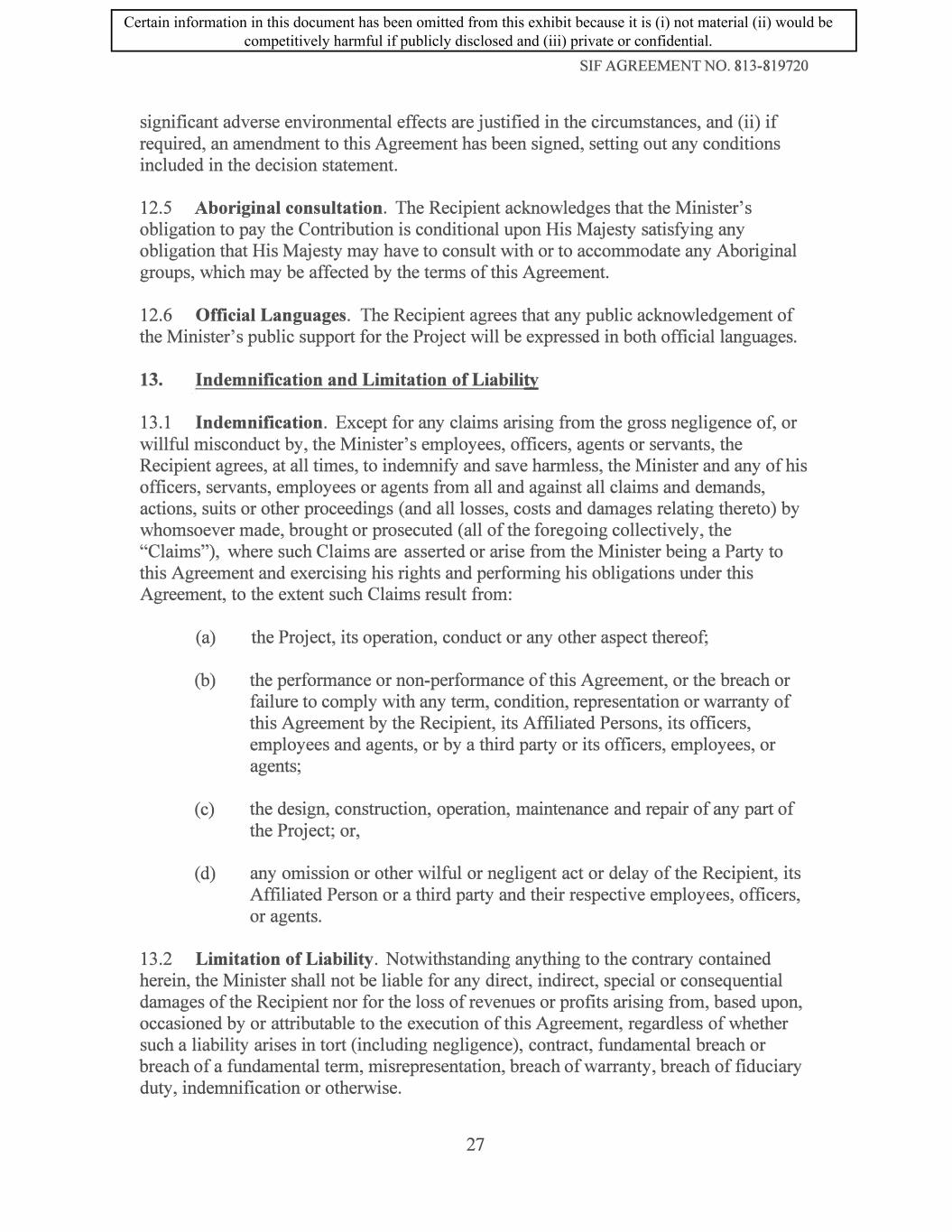 SIF AGREEMENT NO. 813-819720 significant adverse environmental effects are justified in the circumstances, and (ii) if required, an amendment to this Agreement has been signed, setting out any conditions included in the decision statement. 12.5 Aboriginal consultation. The Recipient acknowledges that the Minister's obligation to pay the Contribution is conditional upon His Majesty satisfying any obligation that His Majesty may have to consult with or to accommodate any Aboriginal groups, which may be affected by the terms of this Agreement. 12.6 Official Languages. The Recipient agrees that any public acknowledgement of the Minister's public support for the Project will be expressed in both official languages. 13. Indemnification and Limitation of Liability 13 .1 Indemnification. Except for any claims arising from the gross negligence of, or willful misconduct by, the Minister's employees, officers, agents or servants, the Recipient agrees, at all times, to indemnify and save harmless, the Minister and any of his officers, servants, employees or agents from all and against all claims and demands, actions, suits or other proceedings (and all losses, costs and damages relating thereto) by whomsoever made, brought or prosecuted (all of the foregoing collectively, the "Claims"), where such Claims are asserted or arise from the Minister being a Party to this Agreement and exercising his rights and performing his obligations under this Agreement, to the extent such Claims result from: (a) the Project, its operation, conduct or any other aspect thereof; (b) the performance or non-performance of this Agreement, or the breach or failure to comply with any term, condition, representation or warranty of this Agreement by the Recipient, its Affiliated Persons, its officers, employees and agents, or by a third party or its officers, employees, or agents; ( c) the design, construction, operation, maintenance and repair of any part of the Project; or, ( d) any omission or other wilful or negligent act or delay of the Recipient, its Affiliated Person or a third party and their respective employees, officers, or agents. 13 .2 Limitation of Liability. Notwithstanding anything to the contrary contained herein, the Minister shall not be liable for any direct, indirect, special or consequential damages of the Recipient nor for the loss of revenues or profits arising from, based upon, occasioned by or attributable to the execution of this Agreement, regardless of whether such a liability arises in tort (including negligence), contract, fundamental breach or breach of a fundamental term, misrepresentation, breach of warranty, breach of fiduciary duty, indemnification or otherwise. 27 Certain information in this document has been omitted from this exhibit because it is (i) not material (ii) would be competitively harmful if publicly disclosed and (iii) private or confidential.