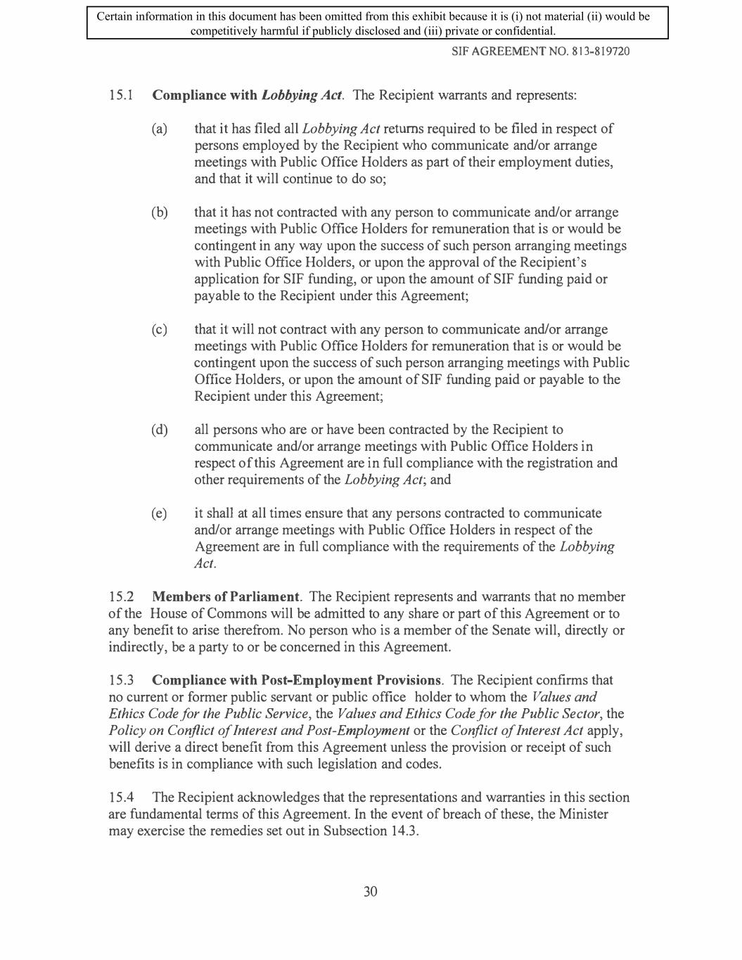 SIF AGREEMENT NO. 813-819720 15 .1 Compliance with Lobbying Act. The Recipient warrants and represents: (a) that it has filed all Lobbying Act returns required to be filed in respect of persons employed by the Recipient who communicate and/or arrange meetings with Public Office Holders as part of their employment duties, and that it will continue to do so; (b) that it has not contracted with any person to communicate and/or arrange meetings with Public Office Holders for remuneration that is or would be contingent in any way upon the success of such person arranging meetings with Public Office Holders, or upon the approval of the Recipient's application for SIF funding, or upon the amount of SIF funding paid or payable to the Recipient under this Agreement; (c) that it will not contract with any person to communicate and/or arrange meetings with Public Office Holders for remuneration that is or would be contingent upon the success of such person arranging meetings with Public Office Holders, or upon the amount of SIF funding paid or payable to the Recipient under this Agreement; ( d) all persons who are or have been contracted by the Recipient to communicate and/or arrange meetings with Public Office Holders in respect of this Agreement are in full compliance with the registration and other requirements of the Lobbying Act; and (e) it shall at all times ensure that any persons contracted to communicate and/or arrange meetings with Public Office Holders in respect of the Agreement are in full compliance with the requirements of the Lobbying Act. 15.2 Members of Parliament. The Recipient represents and warrants that no member of the House of Commons will be admitted to any share or part of this Agreement or to any benefit to arise therefrom. No person who is a member of the Senate will, directly or indirectly, be a party to or be concerned in this Agreement. 15.3 Compliance with Post-Employment Provisions. The Recipient confirms that no current or former public servant or public office holder to whom the Values and Ethics Code for the Public Service, the Values and Ethics Code for the Public Sector, the Policy on Conflict of Interest and Post-Employment or the Conflict of Interest Act apply, will derive a direct benefit from this Agreement unless the provision or receipt of such benefits is in compliance with such legislation and codes. 15.4 The Recipient acknowledges that the representations and warranties in this section are fundamental terms of this Agreement. In the event of breach of these, the Minister may exercise the remedies set out in Subsection 14.3. 30 Certain information in this document has been omitted from this exhibit because it is (i) not material (ii) would be competitively harmful if publicly disclosed and (iii) private or confidential.