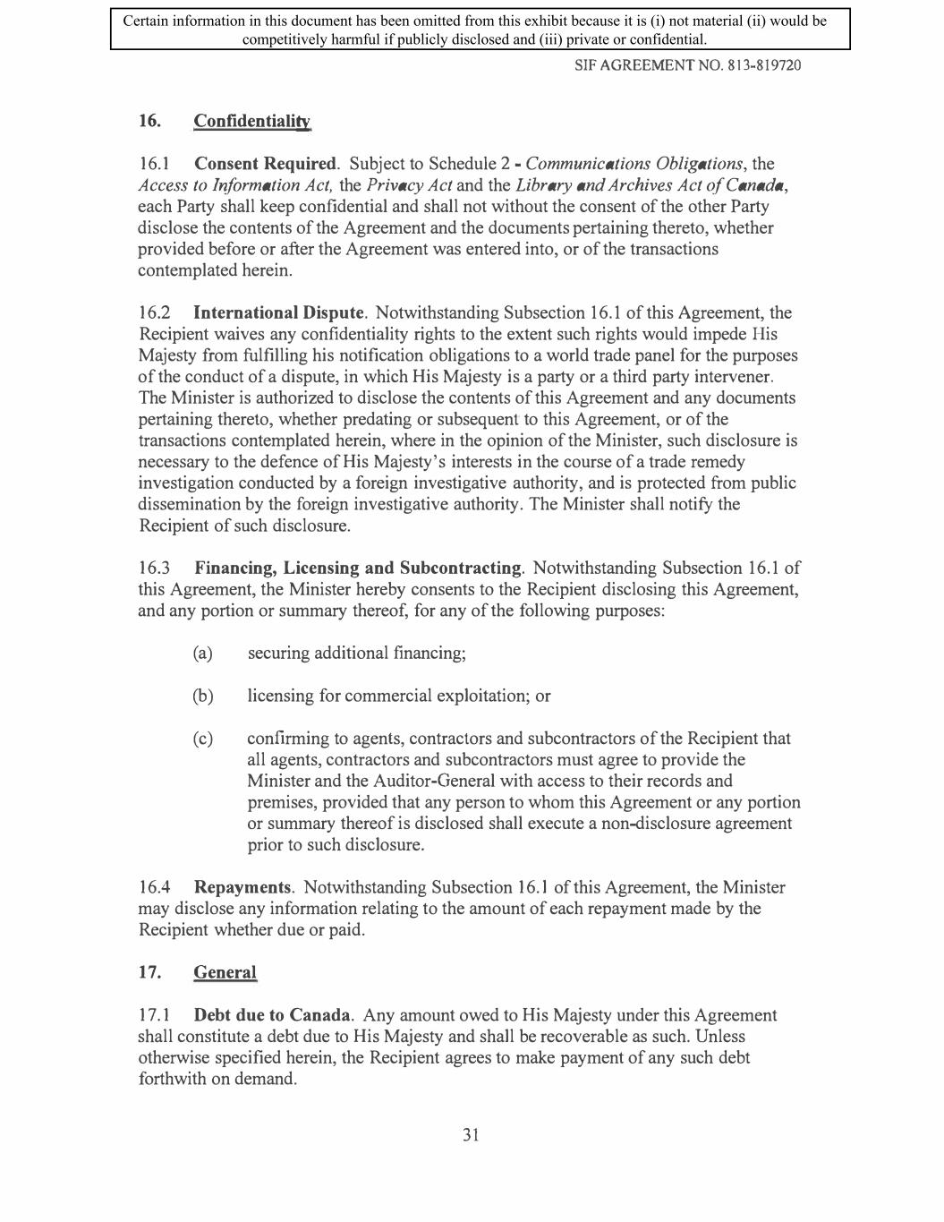 SIF AGREEMENT NO. 813-819720 16. Confidentiality 16.1 Consent Required. Subject to Schedule 2 - Communications Obligations, the Access to Information Act, the Privacy Act and the Library and Archives Act of Canada, each Party shall keep confidential and shall not without the consent of the other Party disclose the contents of the Agreement and the documents pertaining thereto, whether provided before or after the Agreement was entered into, or of the transactions contemplated herein. 16.2 International Dispute. Notwithstanding Subsection 16.1 of this Agreement, the Recipient waives any confidentiality rights to the extent such rights would impede His Majesty from fulfilling his notification obligations to a world trade panel for the purposes of the conduct of a dispute, in which His Majesty is a party or a third party intervener. The Minister is authorized to disclose the contents of this Agreement and any documents pertaining thereto, whether predating or subsequent to this Agreement, or of the transactions contemplated herein, where in the opinion of the Minister, such disclosure is necessary to the defence of His Majesty's interests in the course of a trade remedy investigation conducted by a foreign investigative authority, and is protected from public dissemination by the foreign investigative authority. The Minister shall notify the Recipient of such disclosure. 16.3 Financing, Licensing and Subcontracting. Notwithstanding Subsection 16.1 of this Agreement, the Minister hereby consents to the Recipient disclosing this Agreement, and any portion or summary thereof, for any of the following purposes: (a) securing additional financing; (b) licensing for commercial exploitation; or ( c) confirming to agents, contractors and subcontractors of the Recipient that all agents, contractors and subcontractors must agree to provide the Minister and the Auditor-General with access to their records and premises, provided that any person to whom this Agreement or any portion or summary thereof is disclosed shall execute a non-disclosure agreement prior to such disclosure. 16.4 Repayments. Notwithstanding Subsection 16.l of this Agreement, the Minister may disclose any information relating to the amount of each repayment made by the Recipient whether due or paid. 17. General 17 .1 Debt due to Canada. Any amount owed to His Majesty under this Agreement shall constitute a debt due to His Majesty and shall be recoverable as such. Unless otherwise specified herein, the Recipient agrees to make payment of any such debt forthwith on demand. 31 Certain information in this document has been omitted from this exhibit because it is (i) not material (ii) would be competitively harmful if publicly disclosed and (iii) private or confidential.