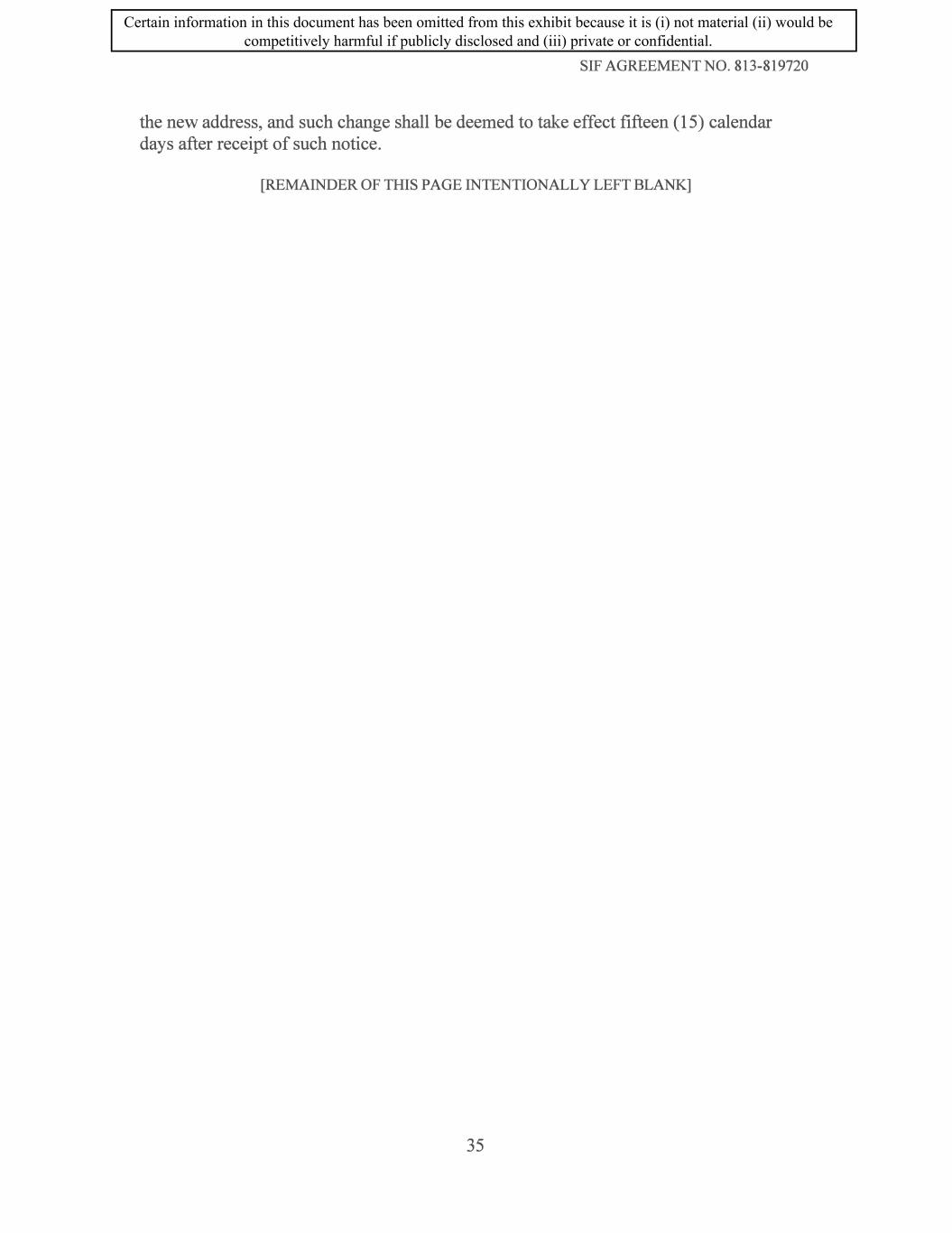 SIF AGREEMENT NO. 813-819720 the new address, and such change shall be deemed to take effect fifteen (15) calendar days after receipt of such notice. [REMAINDER OF THIS PAGE INTENTIONALLY LEFT BLANK] 35 Certain information in this document has been omitted from this exhibit because it is (i) not material (ii) would be competitively harmful if publicly disclosed and (iii) private or confidential.