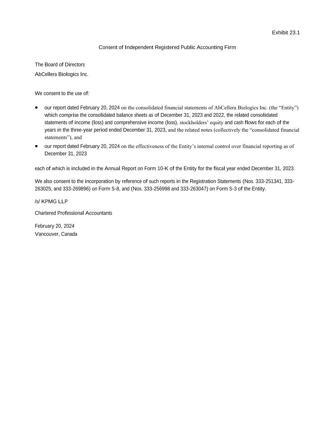 Exhibit 23.1 Consent of Independent Registered Public Accounting Firm The Board of Directors AbCellera Biologics Inc. We consent to the use of: • our report dated February 20, 2024 on the consolidated financial statements of AbCellera Biologics Inc. (the “Entity”) which comprise the consolidated balance sheets as of December 31, 2023 and 2022, the related consolidated statements of income (loss) and comprehensive income (loss), stockholders’ equity and cash flows for each of the years in the three-year period ended December 31, 2023, and the related notes (collectively the “consolidated financial statements”), and • our report dated February 20, 2024 on the effectiveness of the Entity’s internal control over financial reporting as of December 31, 2023 each of which is included in the Annual Report on Form 10-K of the Entity for the fiscal year ended December 31, 2023. We also consent to the incorporation by reference of such reports in the Registration Statements (Nos. 333-251341, 333- 263025, and 333-269896) on Form S-8, and (Nos. 333-256998 and 333-263047) on Form S-3 of the Entity. /s/ KPMG LLP Chartered Professional Accountants February 20, 2024 Vancouver, Canada