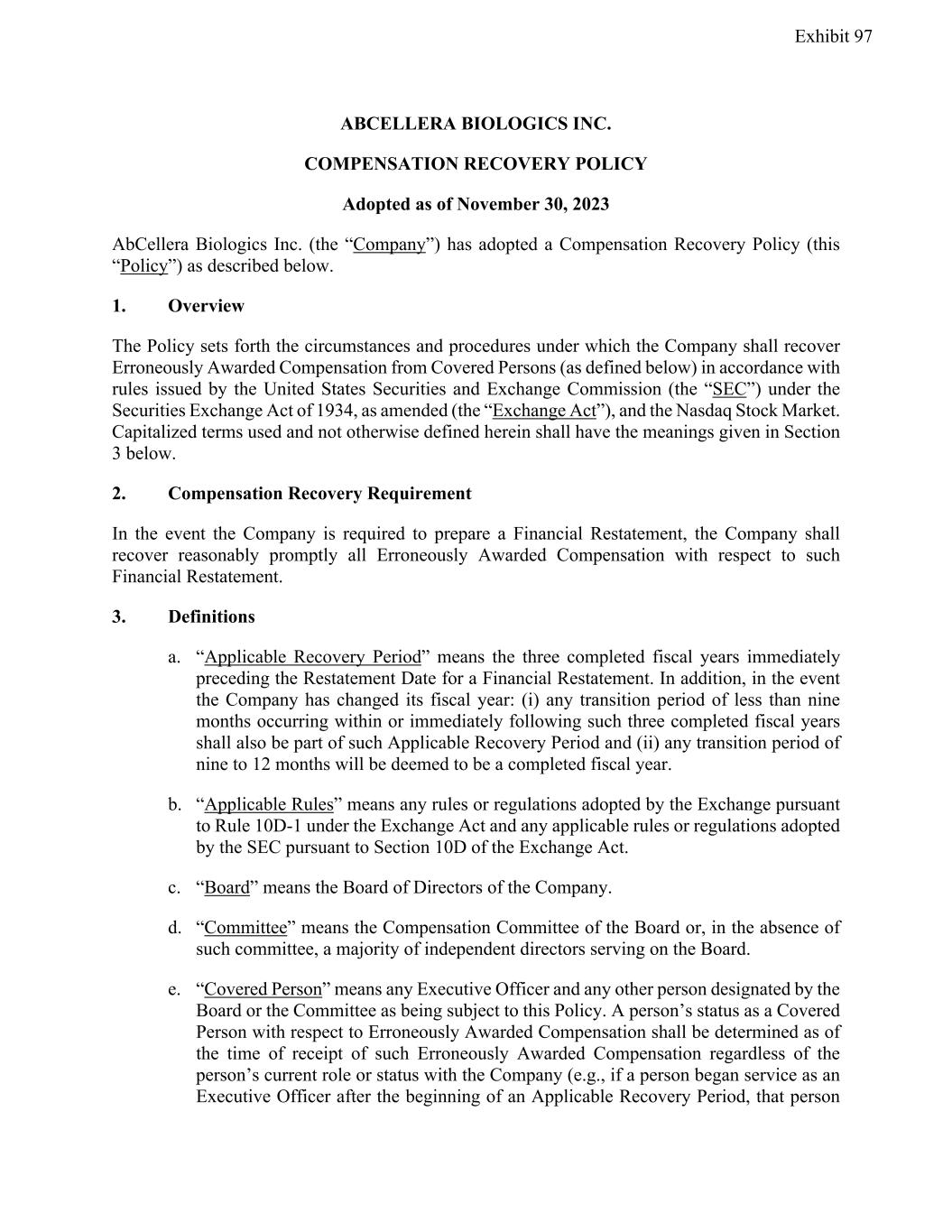 ABCELLERA BIOLOGICS INC. COMPENSATION RECOVERY POLICY Adopted as of November 30, 2023 AbCellera Biologics Inc. (the “Company”) has adopted a Compensation Recovery Policy (this “Policy”) as described below. 1. Overview The Policy sets forth the circumstances and procedures under which the Company shall recover Erroneously Awarded Compensation from Covered Persons (as defined below) in accordance with rules issued by the United States Securities and Exchange Commission (the “SEC”) under the Securities Exchange Act of 1934, as amended (the “Exchange Act”), and the Nasdaq Stock Market. Capitalized terms used and not otherwise defined herein shall have the meanings given in Section 3 below. 2. Compensation Recovery Requirement In the event the Company is required to prepare a Financial Restatement, the Company shall recover reasonably promptly all Erroneously Awarded Compensation with respect to such Financial Restatement. 3. Definitions a. “Applicable Recovery Period” means the three completed fiscal years immediately preceding the Restatement Date for a Financial Restatement. In addition, in the event the Company has changed its fiscal year: (i) any transition period of less than nine months occurring within or immediately following such three completed fiscal years shall also be part of such Applicable Recovery Period and (ii) any transition period of nine to 12 months will be deemed to be a completed fiscal year. b. “Applicable Rules” means any rules or regulations adopted by the Exchange pursuant to Rule 10D-1 under the Exchange Act and any applicable rules or regulations adopted by the SEC pursuant to Section 10D of the Exchange Act. c. “Board” means the Board of Directors of the Company. d. “Committee” means the Compensation Committee of the Board or, in the absence of such committee, a majority of independent directors serving on the Board. e. “Covered Person” means any Executive Officer and any other person designated by the Board or the Committee as being subject to this Policy. A person’s status as a Covered Person with respect to Erroneously Awarded Compensation shall be determined as of the time of receipt of such Erroneously Awarded Compensation regardless of the person’s current role or status with the Company (e.g., if a person began service as an Executive Officer after the beginning of an Applicable Recovery Period, that person Exhibit 97