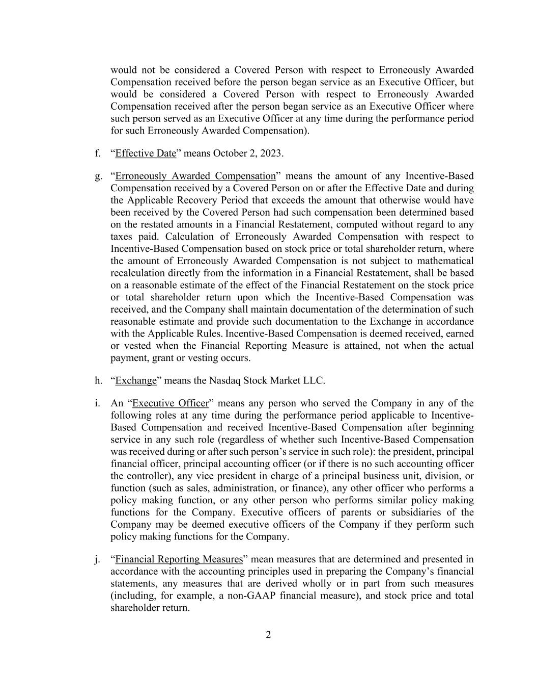 2 would not be considered a Covered Person with respect to Erroneously Awarded Compensation received before the person began service as an Executive Officer, but would be considered a Covered Person with respect to Erroneously Awarded Compensation received after the person began service as an Executive Officer where such person served as an Executive Officer at any time during the performance period for such Erroneously Awarded Compensation). f. “Effective Date” means October 2, 2023. g. “Erroneously Awarded Compensation” means the amount of any Incentive-Based Compensation received by a Covered Person on or after the Effective Date and during the Applicable Recovery Period that exceeds the amount that otherwise would have been received by the Covered Person had such compensation been determined based on the restated amounts in a Financial Restatement, computed without regard to any taxes paid. Calculation of Erroneously Awarded Compensation with respect to Incentive-Based Compensation based on stock price or total shareholder return, where the amount of Erroneously Awarded Compensation is not subject to mathematical recalculation directly from the information in a Financial Restatement, shall be based on a reasonable estimate of the effect of the Financial Restatement on the stock price or total shareholder return upon which the Incentive-Based Compensation was received, and the Company shall maintain documentation of the determination of such reasonable estimate and provide such documentation to the Exchange in accordance with the Applicable Rules. Incentive-Based Compensation is deemed received, earned or vested when the Financial Reporting Measure is attained, not when the actual payment, grant or vesting occurs. h. “Exchange” means the Nasdaq Stock Market LLC. i. An “Executive Officer” means any person who served the Company in any of the following roles at any time during the performance period applicable to Incentive- Based Compensation and received Incentive-Based Compensation after beginning service in any such role (regardless of whether such Incentive-Based Compensation was received during or after such person’s service in such role): the president, principal financial officer, principal accounting officer (or if there is no such accounting officer the controller), any vice president in charge of a principal business unit, division, or function (such as sales, administration, or finance), any other officer who performs a policy making function, or any other person who performs similar policy making functions for the Company. Executive officers of parents or subsidiaries of the Company may be deemed executive officers of the Company if they perform such policy making functions for the Company. j. “Financial Reporting Measures” mean measures that are determined and presented in accordance with the accounting principles used in preparing the Company’s financial statements, any measures that are derived wholly or in part from such measures (including, for example, a non-GAAP financial measure), and stock price and total shareholder return.