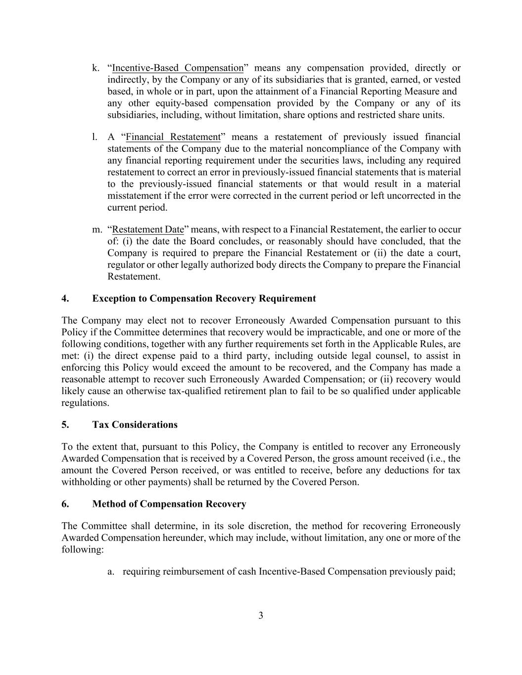 3 k. “Incentive-Based Compensation” means any compensation provided, directly or indirectly, by the Company or any of its subsidiaries that is granted, earned, or vested based, in whole or in part, upon the attainment of a Financial Reporting Measure and any other equity-based compensation provided by the Company or any of its subsidiaries, including, without limitation, share options and restricted share units. l. A “Financial Restatement” means a restatement of previously issued financial statements of the Company due to the material noncompliance of the Company with any financial reporting requirement under the securities laws, including any required restatement to correct an error in previously-issued financial statements that is material to the previously-issued financial statements or that would result in a material misstatement if the error were corrected in the current period or left uncorrected in the current period. m. “Restatement Date” means, with respect to a Financial Restatement, the earlier to occur of: (i) the date the Board concludes, or reasonably should have concluded, that the Company is required to prepare the Financial Restatement or (ii) the date a court, regulator or other legally authorized body directs the Company to prepare the Financial Restatement. 4. Exception to Compensation Recovery Requirement The Company may elect not to recover Erroneously Awarded Compensation pursuant to this Policy if the Committee determines that recovery would be impracticable, and one or more of the following conditions, together with any further requirements set forth in the Applicable Rules, are met: (i) the direct expense paid to a third party, including outside legal counsel, to assist in enforcing this Policy would exceed the amount to be recovered, and the Company has made a reasonable attempt to recover such Erroneously Awarded Compensation; or (ii) recovery would likely cause an otherwise tax-qualified retirement plan to fail to be so qualified under applicable regulations. 5. Tax Considerations To the extent that, pursuant to this Policy, the Company is entitled to recover any Erroneously Awarded Compensation that is received by a Covered Person, the gross amount received (i.e., the amount the Covered Person received, or was entitled to receive, before any deductions for tax withholding or other payments) shall be returned by the Covered Person. 6. Method of Compensation Recovery The Committee shall determine, in its sole discretion, the method for recovering Erroneously Awarded Compensation hereunder, which may include, without limitation, any one or more of the following: a. requiring reimbursement of cash Incentive-Based Compensation previously paid;
