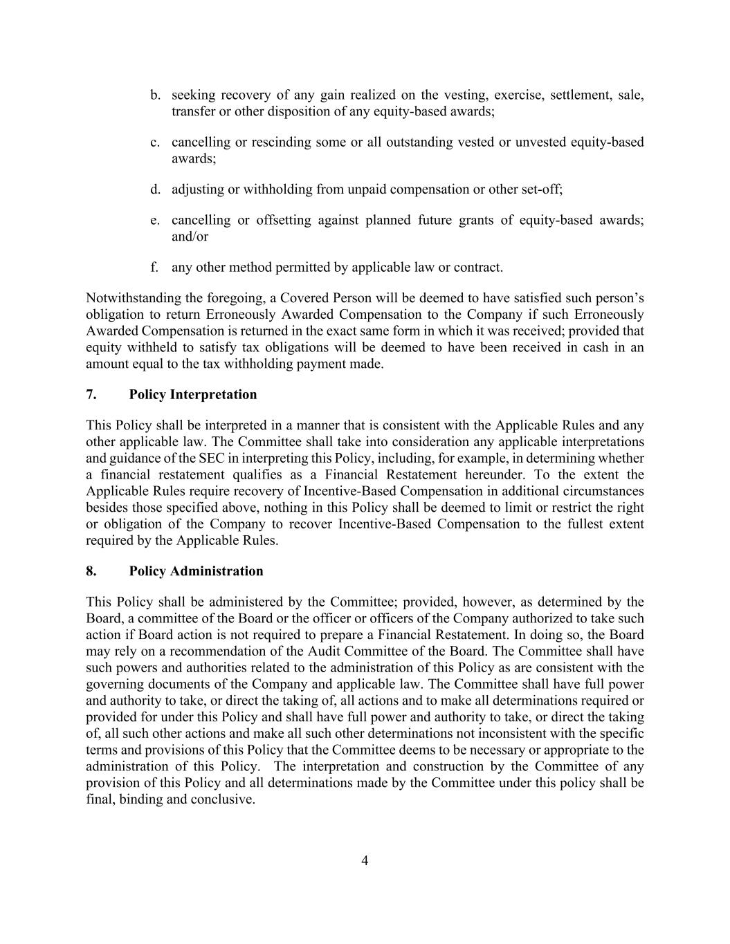 4 b. seeking recovery of any gain realized on the vesting, exercise, settlement, sale, transfer or other disposition of any equity-based awards; c. cancelling or rescinding some or all outstanding vested or unvested equity-based awards; d. adjusting or withholding from unpaid compensation or other set-off; e. cancelling or offsetting against planned future grants of equity-based awards; and/or f. any other method permitted by applicable law or contract. Notwithstanding the foregoing, a Covered Person will be deemed to have satisfied such person’s obligation to return Erroneously Awarded Compensation to the Company if such Erroneously Awarded Compensation is returned in the exact same form in which it was received; provided that equity withheld to satisfy tax obligations will be deemed to have been received in cash in an amount equal to the tax withholding payment made. 7. Policy Interpretation This Policy shall be interpreted in a manner that is consistent with the Applicable Rules and any other applicable law. The Committee shall take into consideration any applicable interpretations and guidance of the SEC in interpreting this Policy, including, for example, in determining whether a financial restatement qualifies as a Financial Restatement hereunder. To the extent the Applicable Rules require recovery of Incentive-Based Compensation in additional circumstances besides those specified above, nothing in this Policy shall be deemed to limit or restrict the right or obligation of the Company to recover Incentive-Based Compensation to the fullest extent required by the Applicable Rules. 8. Policy Administration This Policy shall be administered by the Committee; provided, however, as determined by the Board, a committee of the Board or the officer or officers of the Company authorized to take such action if Board action is not required to prepare a Financial Restatement. In doing so, the Board may rely on a recommendation of the Audit Committee of the Board. The Committee shall have such powers and authorities related to the administration of this Policy as are consistent with the governing documents of the Company and applicable law. The Committee shall have full power and authority to take, or direct the taking of, all actions and to make all determinations required or provided for under this Policy and shall have full power and authority to take, or direct the taking of, all such other actions and make all such other determinations not inconsistent with the specific terms and provisions of this Policy that the Committee deems to be necessary or appropriate to the administration of this Policy. The interpretation and construction by the Committee of any provision of this Policy and all determinations made by the Committee under this policy shall be final, binding and conclusive.