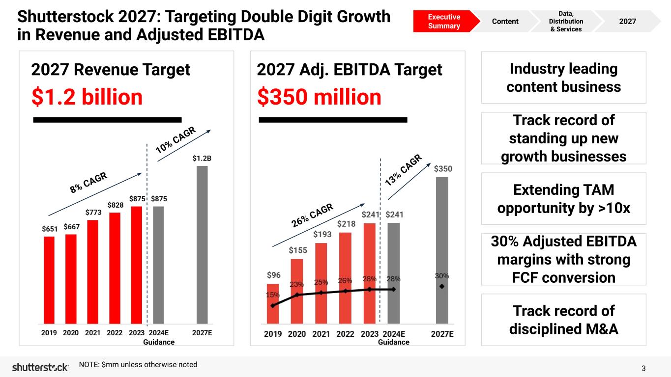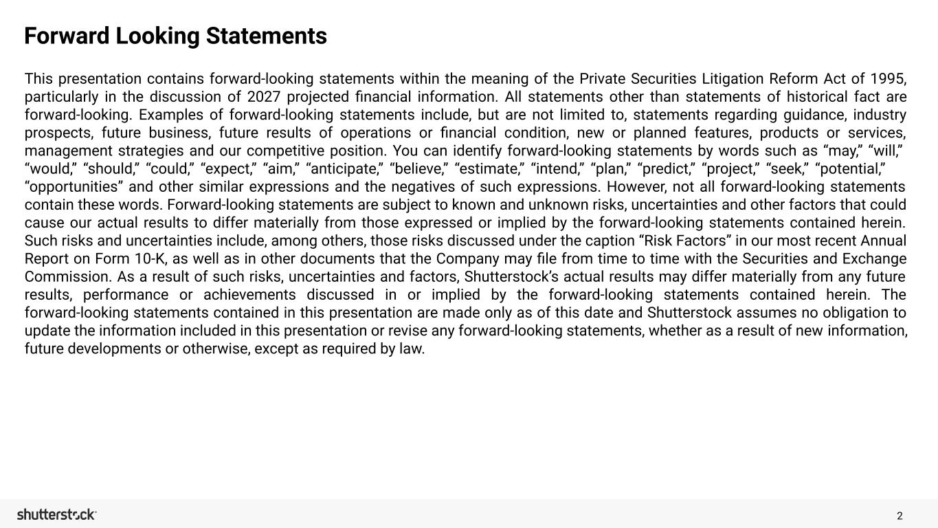 2 Forward Looking Statements This presentation contains forward-looking statements within the meaning of the Private Securities Litigation Reform Act of 1995, particularly in the discussion of 2027 projected financial information. All statements other than statements of historical fact are forward-looking. Examples of forward-looking statements include, but are not limited to, statements regarding guidance, industry prospects, future business, future results of operations or financial condition, new or planned features, products or services, management strategies and our competitive position. You can identify forward-looking statements by words such as “may,” “will,” “would,” “should,” “could,” “expect,” “aim,” “anticipate,” “believe,” “estimate,” “intend,” “plan,” “predict,” “project,” “seek,” “potential,” “opportunities” and other similar expressions and the negatives of such expressions. However, not all forward-looking statements contain these words. Forward-looking statements are subject to known and unknown risks, uncertainties and other factors that could cause our actual results to differ materially from those expressed or implied by the forward-looking statements contained herein. Such risks and uncertainties include, among others, those risks discussed under the caption “Risk Factors” in our most recent Annual Report on Form 10-K, as well as in other documents that the Company may file from time to time with the Securities and Exchange Commission. As a result of such risks, uncertainties and factors, Shutterstock’s actual results may differ materially from any future results, performance or achievements discussed in or implied by the forward-looking statements contained herein. The forward-looking statements contained in this presentation are made only as of this date and Shutterstock assumes no obligation to update the information included in this presentation or revise any forward-looking statements, whether as a result of new information, future developments or otherwise, except as required by law.