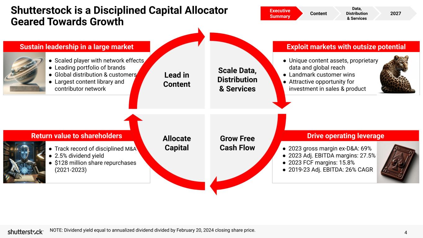 3NOTE: $mm unless otherwise noted Guidance Industry leading content business Shutterstock 2027: Targeting Double Digit Growth in Revenue and Adjusted EBITDA Track record of standing up new growth businesses Extending TAM opportunity by >10x ContentExecutive Summary Data, Distribution & Services 30% Adjusted EBITDA margins with strong FCF conversion 2027 Track record of disciplined M&A $1.2 billion 2027 Revenue Target 10% CAGR $350 million 2027 Adj. EBITDA Target 13% CAGR 8% CAGR Guidance 26% CAGR