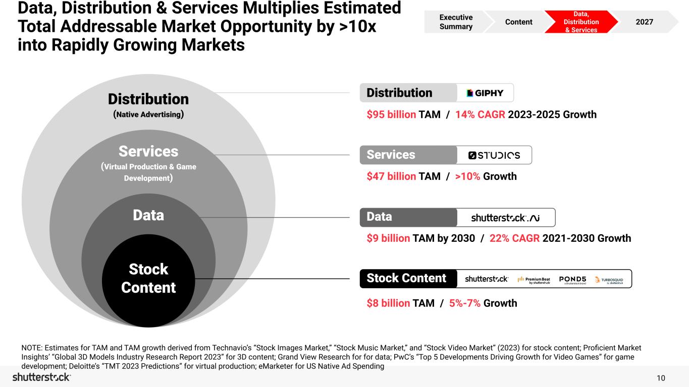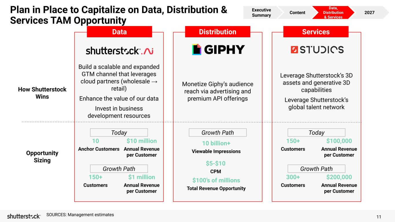 10 Data $9 billion TAM by 2030 / 22% CAGR 2021-2030 Growth Services $47 billion TAM / >10% Growth Distribution $95 billion TAM / 14% CAGR 2023-2025 Growth Stock Content Stock Content $8 billion TAM / 5%-7% Growth Data Services (Virtual Production & Game Development) Distribution (Native Advertising) ContentExecutive Summary Data, Distribution & Services 2027 Data, Distribution & Services Multiplies Estimated Total Addressable Market Opportunity by >10x into Rapidly Growing Markets NOTE: Estimates for TAM and TAM growth derived from Technavio’s “Stock Images Market,” “Stock Music Market,” and “Stock Video Market” (2023) for stock content; Proficient Market Insights’ “Global 3D Models Industry Research Report 2023” for 3D content; Grand View Research for for data; PwC’s “Top 5 Developments Driving Growth for Video Games” for game development; Deloitte’s “TMT 2023 Predictions” for virtual production; eMarketer for US Native Ad Spending