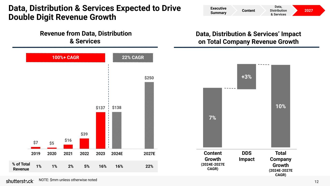 11 How Shutterstock Wins Monetize Giphy’s audience reach via advertising and premium API offerings Leverage Shutterstock’s 3D assets and generative 3D capabilities Leverage Shutterstock’s global talent network Build a scalable and expanded GTM channel that leverages cloud partners (wholesale → retail) Enhance the value of our data Invest in business development resources Opportunity Sizing Data Distribution Services Today Anchor Customers 10 Annual Revenue per Customer $10 million Customers 150+ Annual Revenue per Customer $1 million Viewable Impressions 10 billion+ CPM $5-$10 Customers 150+ Annual Revenue per Customer $100,000 Customers 300+ Annual Revenue per Customer $200,000 ContentExecutive Summary Data, Distribution & Services 2027 Total Revenue Opportunity $100’s of millions Today Growth Path Growth Path SOURCES: Management estimates Plan in Place to Capitalize on Data, Distribution & Services TAM Opportunity Growth Path