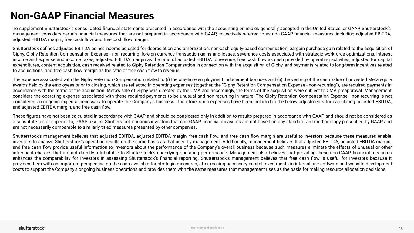 16Proprietary and confidential 16 To supplement Shutterstock’s consolidated financial statements presented in accordance with the accounting principles generally accepted in the United States, or GAAP, Shutterstock’s management considers certain financial measures that are not prepared in accordance with GAAP, collectively referred to as non-GAAP financial measures, including adjusted EBITDA, adjusted EBITDA margin, free cash flow, and free cash flow margin. Shutterstock defines adjusted EBITDA as net income adjusted for depreciation and amortization, non-cash equity-based compensation, bargain purchase gain related to the acquisition of Giphy, Giphy Retention Compensation Expense - non-recurring, foreign currency transaction gains and losses, severance costs associated with strategic workforce optimizations, interest income and expense and income taxes; adjusted EBITDA margin as the ratio of adjusted EBITDA to revenue; free cash flow as cash provided by operating activities, adjusted for capital expenditures, content acquisition, cash received related to Giphy Retention Compensation in connection with the acquisition of Giphy, and payments related to long-term incentives related to acquisitions, and free cash flow margin as the ratio of free cash flow to revenue. The expense associated with the Giphy Retention Compensation related to (i) the one-time employment inducement bonuses and (ii) the vesting of the cash value of unvested Meta equity awards held by the employees prior to closing, which are reflected in operating expenses (together, the “Giphy Retention Compensation Expense - non-recurring”), are required payments in accordance with the terms of the acquisition. Meta’s sale of Giphy was directed by the CMA and accordingly, the terms of the acquisition were subject to CMA preapproval. Management considers the operating expense associated with these required payments to be unusual and non-recurring in nature. The Giphy Retention Compensation Expense - non-recurring is not considered an ongoing expense necessary to operate the Company’s business. Therefore, such expenses have been included in the below adjustments for calculating adjusted EBITDA, and adjusted EBITDA margin, and free cash flow. These figures have not been calculated in accordance with GAAP and should be considered only in addition to results prepared in accordance with GAAP and should not be considered as a substitute for, or superior to, GAAP results. Shutterstock cautions investors that non-GAAP financial measures are not based on any standardized methodology prescribed by GAAP and are not necessarily comparable to similarly-titled measures presented by other companies. Shutterstock’s management believes that adjusted EBITDA, adjusted EBITDA margin, free cash flow, and free cash flow margin are useful to investors because these measures enable investors to analyze Shutterstock’s operating results on the same basis as that used by management. Additionally, management believes that adjusted EBITDA, adjusted EBITDA margin, and free cash flow provide useful information to investors about the performance of the Company’s overall business because such measures eliminate the effects of unusual or other infrequent charges that are not directly attributable to Shutterstock’s underlying operating performance. Management also believes that providing these non-GAAP financial measures enhances the comparability for investors in assessing Shutterstock’s financial reporting. Shutterstock’s management believes that free cash flow is useful for investors because it provides them with an important perspective on the cash available for strategic measures, after making necessary capital investments in internal-use software and website development costs to support the Company’s ongoing business operations and provides them with the same measures that management uses as the basis for making resource allocation decisions. Non-GAAP Financial Measures