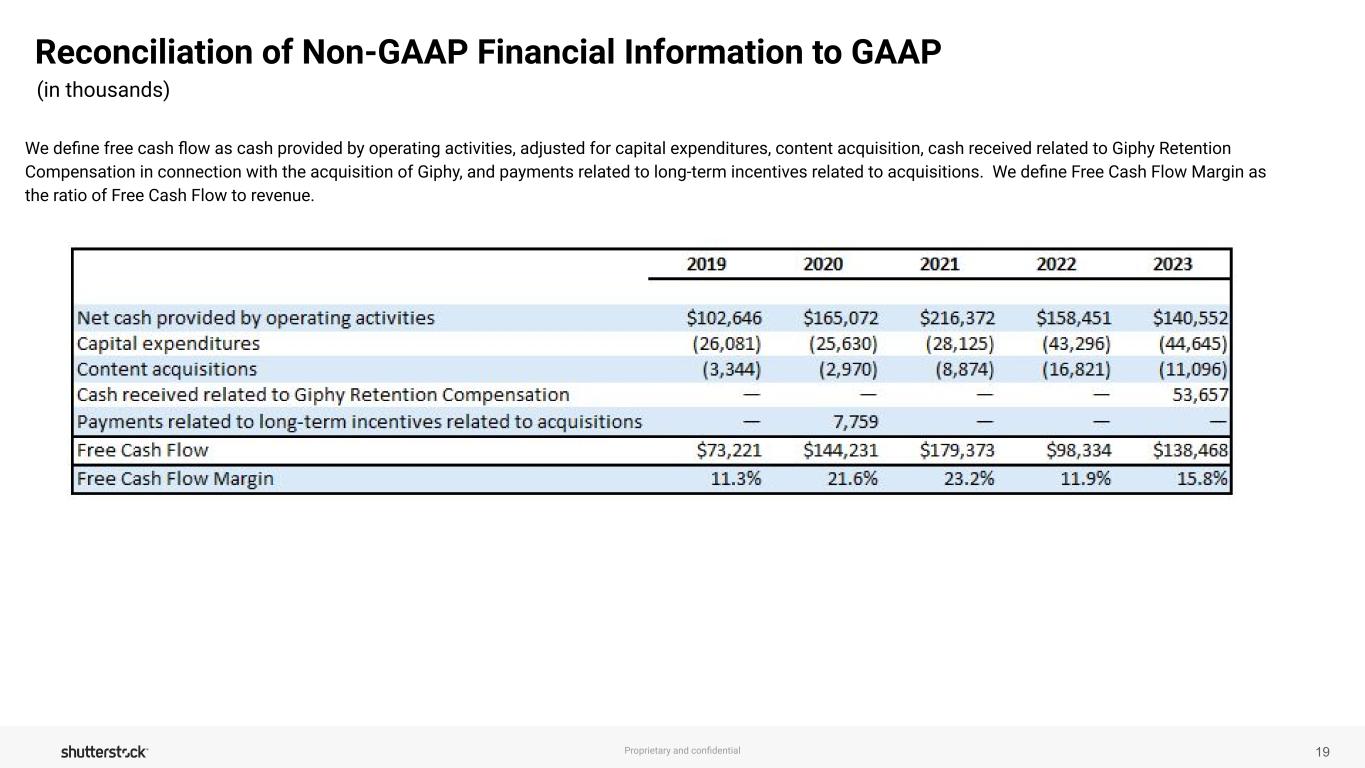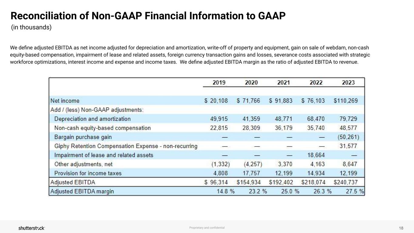 17Proprietary and confidential 17 Shutterstock’s management also uses the non-GAAP financial measures adjusted EBITDA, adjusted EBITDA margin, free cash flow, and free cash flow margin in conjunction with GAAP financial measures, as an integral part of managing the business and to, among other things: (i) monitor and evaluate the performance of Shutterstock’s business operations, financial performance and overall liquidity; (ii) facilitate management’s internal comparisons of the historical operating performance of its business operations; (iii) facilitate management’s external comparisons of the results of its overall business to the historical operating performance of other companies that may have different capital structures and debt levels; (iv) review and assess the operating performance of Shutterstock’s management team and, together with other operational objectives, as a measure in evaluating employee compensation and bonuses; (v) analyze and evaluate financial and strategic planning decisions regarding future operating investments; and (vi) plan for and prepare future annual operating budgets and determine appropriate levels of operating investments. Reconciliations of the differences between adjusted EBITDA, adjusted EBITDA margin, free cash flow, and free cash flow margin and the most comparable financial measures calculated and presented in accordance with GAAP, are presented under the headings “Reconciliation of Non-GAAP Financial Information to GAAP” immediately following the presentation. We do not provide a reconciliation of adjusted EBITDA guidance to net income guidance because we are unable to calculate with reasonable certainty the impact of potential future transactions, including, but not limited to, capital structure transactions, restructuring, acquisitions, divestitures or other events and asset impairments, without unreasonable effort. These amounts depend on various factors and could have a material impact on net income, but may be excluded from adjusted EBITDA. In addition, we believe such reconciliations would imply a degree of precision that would be confusing or misleading to investors. For the same reasons, the Company is unable to address the probable significance of the unavailable information. Non-GAAP Financial Measures