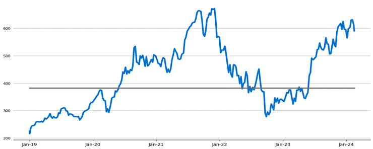 The following graph sets forth the daily historical performance of ADBE in the period from January 2, 2019 through the pricing date. We obtained this historical data from Bloomberg L.P. We have not independently verified the accuracy or completeness of the information obtained from Bloomberg L.P. The Closing Market Prices reflected in the graph below may have been adjusted to reflect certain corporate actions, such as stock splits and reverse stock splits. The horizontal line in the graph represents ADBE’s Coupon Barrier and Threshold Value of $382.66 (rounded to two decimal places), which is 70% of ADBE’s Starting Value of $546.66.