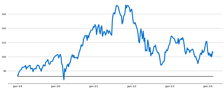 The following graph sets forth the daily historical performance of NKE in the period from January 2, 2019 through the pricing date. We obtained this historical data from Bloomberg L.P. We have not independently verified the accuracy or completeness of the information obtained from Bloomberg L.P. The Closing Market Prices reflected in the graph below may have been adjusted to reflect certain corporate actions, such as stock splits and reverse stock splits. The horizontal line in the graph represents NKE’s Coupon Barrier and Threshold Value of $72.46 (rounded to two decimal places), which is 70% of NKE’s Starting Value of $103.51.
