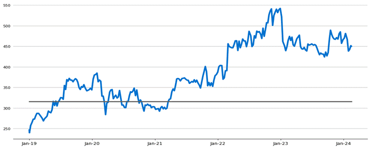 The following graph sets forth the daily historical performance of NOC in the period from January 2, 2019 through the pricing date. We obtained this historical data from Bloomberg L.P. We have not independently verified the accuracy or completeness of the information obtained from Bloomberg L.P. The Closing Market Prices reflected in the graph below may have been adjusted to reflect certain corporate actions, such as stock splits and reverse stock splits. The horizontal line in the graph represents NOC’s Coupon Barrier and Threshold Value of $315.67 (rounded to two decimal places), which is 70% of NOC’s Starting Value of $450.96.