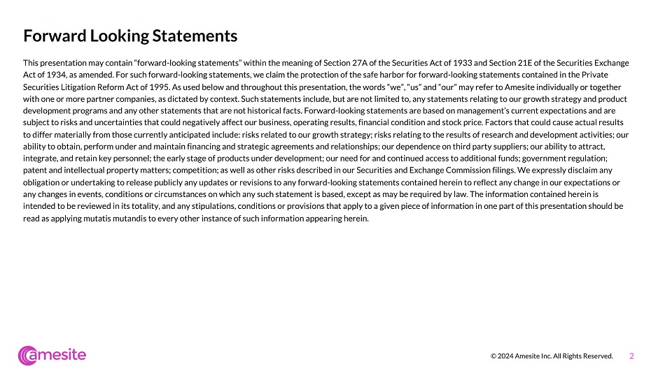 Forward Looking Statements This presentation may contain “forward - looking statements” within the meaning of Section 27A of the Securities Act of 1933 and Section 21E of the Securities Exchange Act of 1934, as amended. For such forward - looking statements, we claim the protection of the safe harbor for forward - looking statements contained in the Private Securities Litigation Reform Act of 1995. As used below and throughout this presentation, the words “we”, “us” and “our” may refer to Amesite individually or together with one or more partner companies, as dictated by context. Such statements include, but are not limited to, any statements relating to our growth strategy and product development programs and any other statements that are not historical facts. Forward - looking statements are based on management’s current expectations and are subject to risks and uncertainties that could negatively affect our business, operating results, financial condition and stock price. Factors that could cause actual results to differ materially from those currently anticipated include: risks related to our growth strategy; risks relating to the results of research and development activities; our ability to obtain, perform under and maintain financing and strategic agreements and relationships; our dependence on third party suppliers; our ability to attract, integrate, and retain key personnel; the early stage of products under development; our need for and continued access to additional funds; government regulation; patent and intellectual property matters; competition; as well as other risks described in our Securities and Exchange Commission filings. We expressly disclaim any obligation or undertaking to release publicly any updates or revisions to any forward - looking statements contained herein to reflect any change in our expectations or any changes in events, conditions or circumstances on which any such statement is based, except as may be required by law. The information contained herein is intended to be reviewed in its totality, and any stipulations, conditions or provisions that apply to a given piece of information in one part of this presentation should be read as applying mutatis mutandis to every other instance of such information appearing herein. 2 © 2024 Amesite Inc. All Rights Reserved.