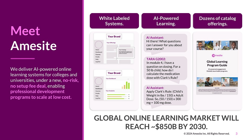 Meet Amesite We deliver AI - powered online learning systems for colleges and universities, under a new, no - risk, no setup fee deal, enabling professional development programs to scale at low cost. GLOBAL ONLINE LEARNING MARKET WILL REACH ~$850B BY 2030. White Labeled Systems. AI - Powered Learning. Dozens of catalog offerings. AI Assistant: Hi there! What questions can I answer for you about your course? AI Assistant: Apply Clark's Rule: (Child's Weight in lbs / 150) x Adult Dose. So, (50 / 150) x 300 mg = 100 mg dose. TARA G2002: In module 4, I have a question on dosing. For a 50 lb child, how do I calculate the medication dose with Clark's Rule? 3 © 2024 Amesite Inc. All Rights Reserved.