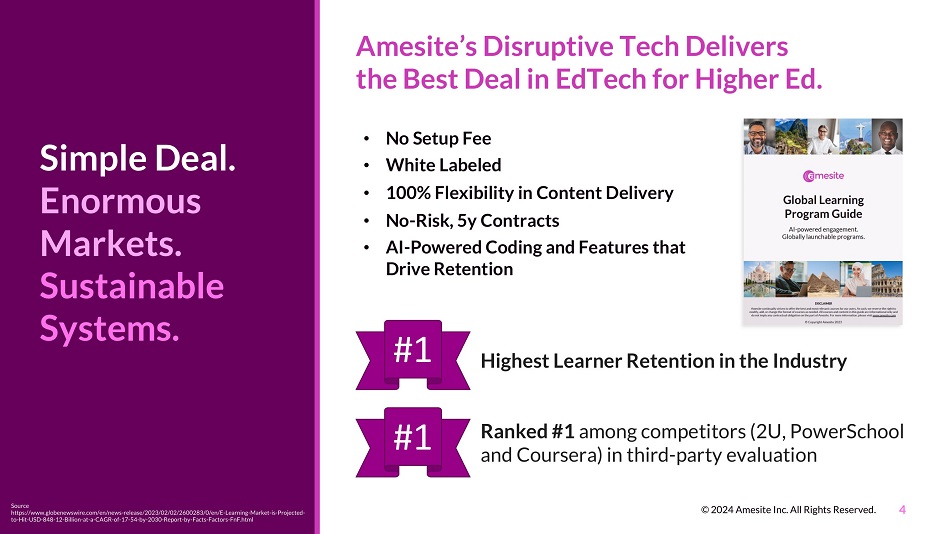 4 Simple Deal. Enormous Markets. Sustainable Systems. Source https://www.globenewswire.com/en/news - release/2023/02/02/2600283/0/en/E - Learning - Market - is - Projected - to - Hit - USD - 848 - 12 - Billion - at - a - CAGR - of - 17 - 54 - by - 2030 - Report - by - Facts - Factors - FnF.html © 2024 Amesite Inc. All Rights Reserved. Amesite’s Disruptive Tech Delivers the Best Deal in EdTech for Higher Ed. • No Setup Fee • White Labeled • 100% Flexibility in Content Delivery • No - Risk, 5y Contracts • AI - Powered Coding and Features that Drive Retention Ranked #1 among competitors (2U, PowerSchool and Coursera) in third - party evaluation #1 #1 Highest Learner Retention in the Industry