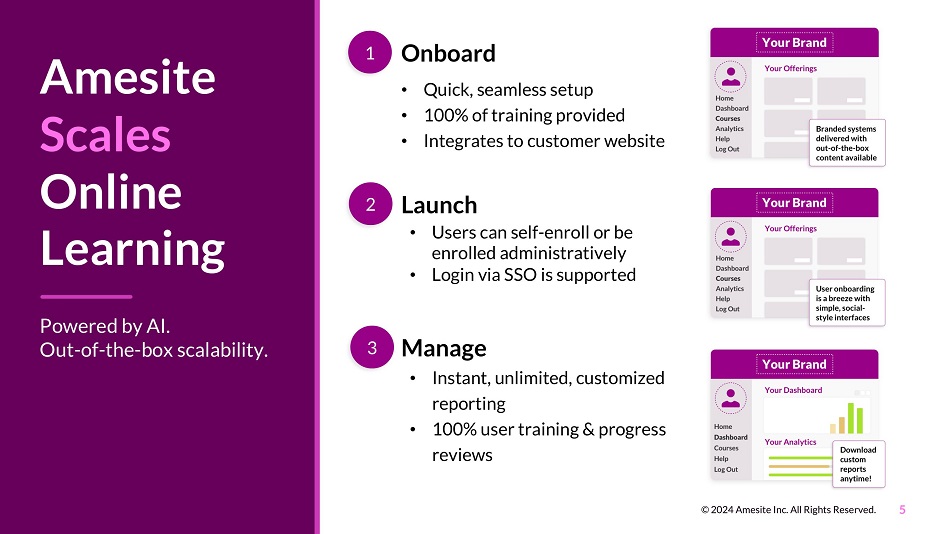 Amesite Scales Online Learning Powered by AI. Out - of - the - box scalability. 1 Onboard 2 Launch • Users can self - enroll or be enrolled administratively • Login via SSO is supported 3 Manage • Instant, unlimited, customized reporting • 100% user training & progress reviews • Quick, seamless setup • 100% of training provided • Integrates to customer website 5 © 2024 Amesite Inc. All Rights Reserved.