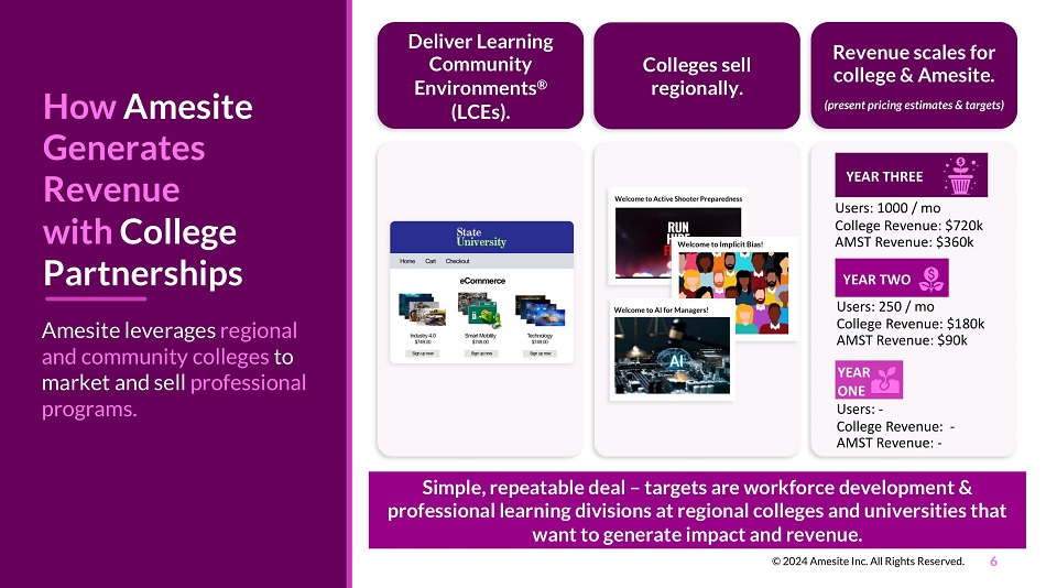 How Amesite Generates Revenue with College Partnerships Amesite leverages regional and community colleges to market and sell professional programs. Simple, repeatable deal – targets are workforce development & professional learning divisions at regional colleges and universities that want to generate impact and revenue. Deliver Learning Community Environments ® (LCEs). Colleges sell regionally. Revenue scales for college & Amesite. (present pricing estimates & targets) YEAR ONE 6 © 2024 Amesite Inc. All Rights Reserved. YEAR TWO YEAR THREE Users: - College Revenue: - AMST Revenue: - Users: 250 / mo College Revenue: $180k AMST Revenue: $90k Users: 1000 / mo College Revenue: $720k AMST Revenue: $360k