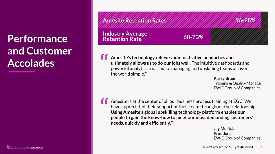 7 Performance and Customer Accolades © 2024 Amesite Inc. All Rights Reserved. Amesite Retention Rates Industry Average Retention Rate 96 - 98% 68 - 73% Source https://files.eric.ed.gov/fulltext/EJ1154164.pdf Amesite’s technology relieves administrative headaches and ultimately allows us to do our jobs well. The intuitive dashboards and powerful analytics tools make managing and upskilling teams all over the world simple.” Kasey Braun Training & Quality Manager EWIE Group of Companies Amesite is at the center of all our business process training at EGC. We have appreciated their support of their team throughout the relationship. Using Amesite’s global upskilling technology platform enables our people to gain the know - how to meet our most demanding customers’ needs, quickly and efficiently.” Jay Mullick President EWIE Group of Companies “ “