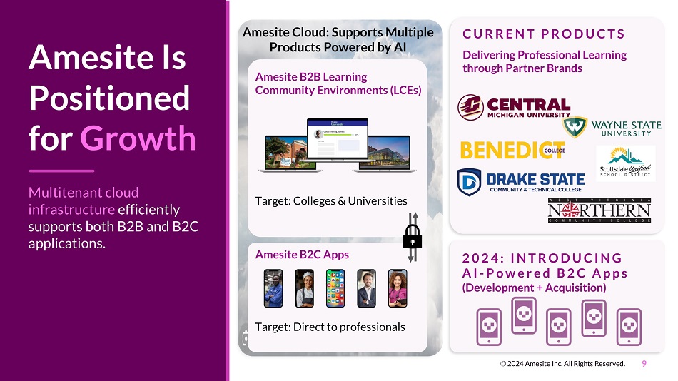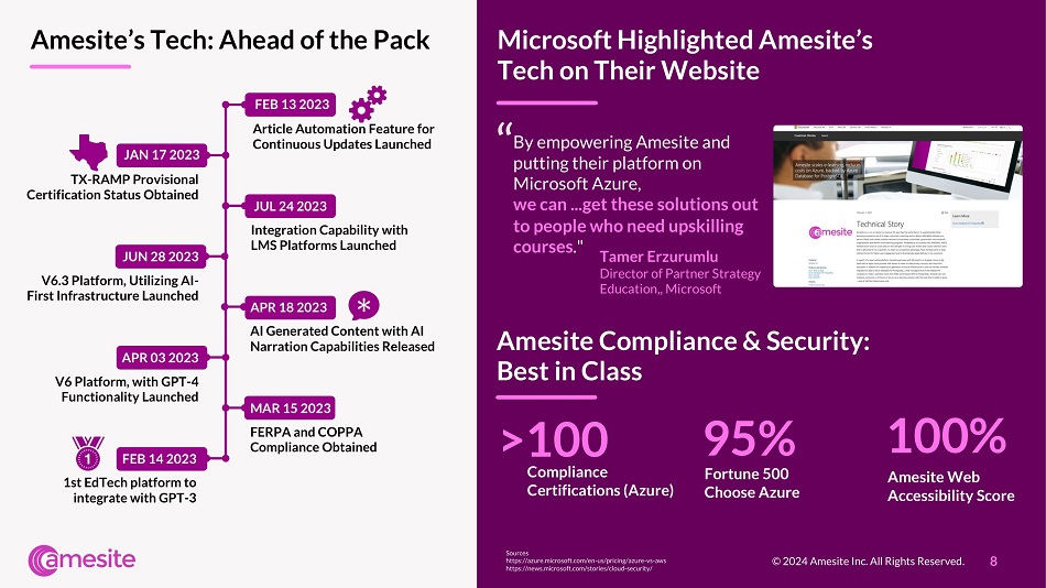 8 By empowering Amesite and putting their platform on Microsoft Azure, we can ...get these solutions out to people who need upskilling courses ." “ Tamer Erzurumlu Director of Partner Strategy Education,, Microsoft © 2024 Amesite Inc. All Rights Reserved. Amesite’s Tech: Ahead of the Pack Microsoft Highlighted Amesite’s Tech on Their Website Sources https://azure.microsoft.com/en - us/pricing/azure - vs - aws https://news.microsoft.com/stories/cloud - security/ >100 Compliance Certifications (Azure) 95% Fortune 500 Choose Azure Amesite Compliance & Security: Best in Class 100% Amesite Web Accessibility Score FEB 14 2023 1st EdTech platform to integrate with GPT - 3 MAR 15 2023 FERPA and COPPA Compliance Obtained APR 03 2023 V6 Platform, with GPT - 4 Functionality Launched APR 18 2023 AI Generated Content with AI Narration Capabilities Released JUN 28 2023 V6.3 Platform, Utilizing AI - First Infrastructure Launched JUL 24 2023 Integration Capability with LMS Platforms Launched JAN 17 2023 TX - RAMP Provisional Certification Status Obtained FEB 13 2023 Article Automation Feature for Continuous Updates Launched