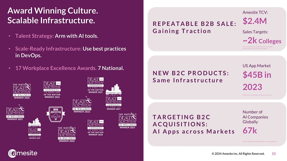Amesite Is Positioned for Growth Multitenant cloud infrastructure efficiently supports both B2B and B2C applications. Amesite Cloud: Supports Multiple Products Powered by AI Amesite B2B Learning Community Environments (LCEs) Amesite B2C Apps Target: Colleges & Universities Target: Direct to professionals CU R R E N T PR O D U C T S Delivering Professional Learning through Partner Brands 2024: I N T R O D U C I N G AI - Pow er ed B 2 C A p p s (Development + Acquisition) 9 © 2024 Amesite Inc. All Rights Reserved.